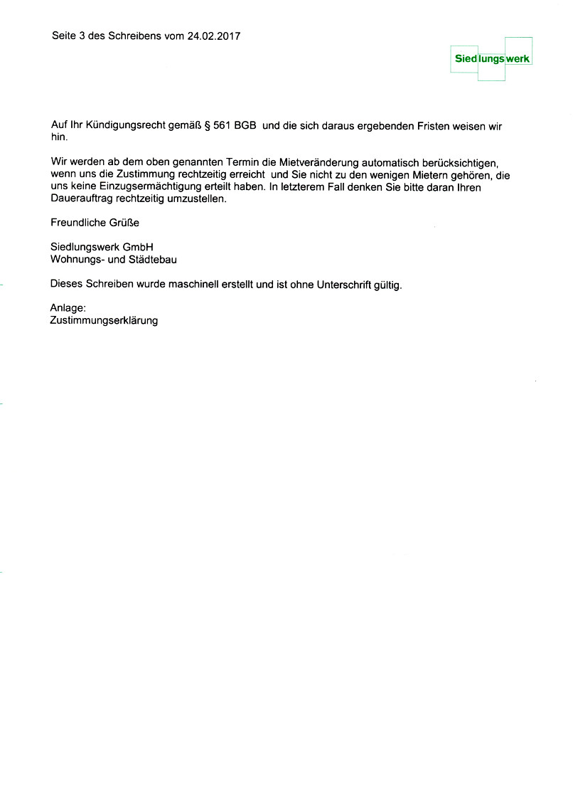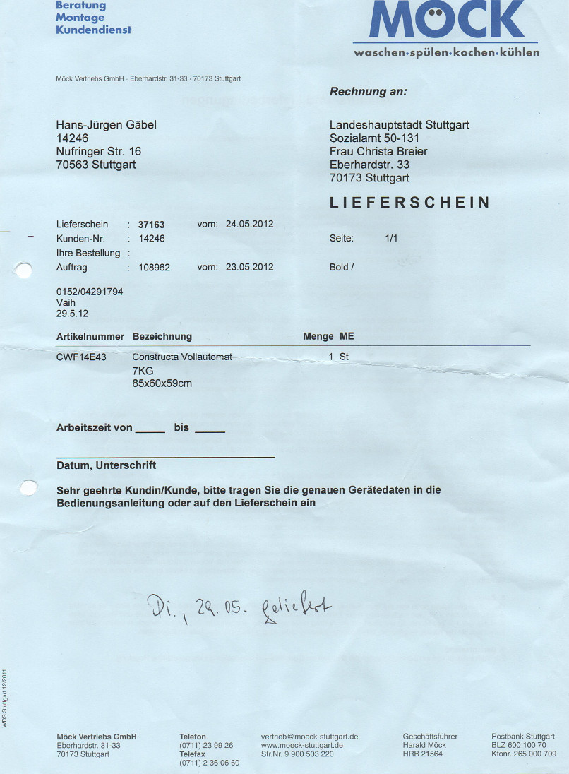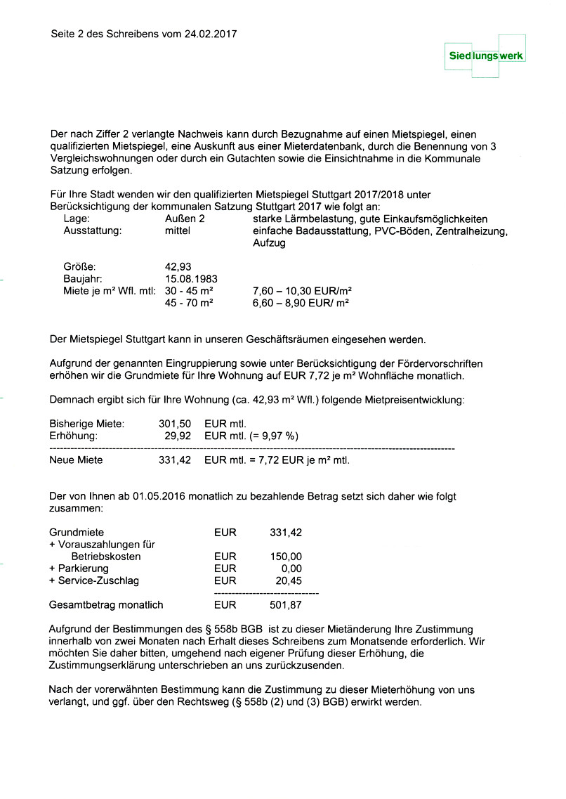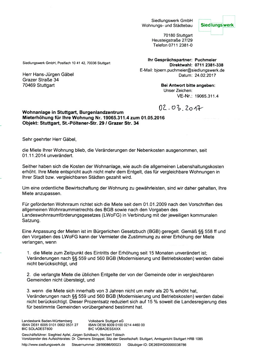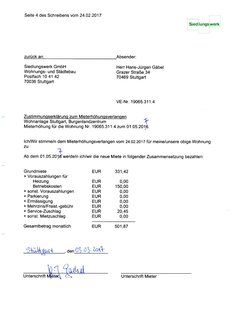 | Lieferschein über die Ende Mai 2012 in die Nufringer Str. 16 gelieferte Waschmaschine  Betriebskostenabrechnung 2014 (Nov. + Dez.) für Wohnung Grazer Str.          Schreiben Siedlungswerk Stuttgart vom 24. Februar 2017 wegen Mieterhöhung    Zustimmungserklärung vom 03. März 2017 wegen Mieterhöhung  Schreiben Siedlungswerk Stuttgart vom 28. Februar 2017 wegen Korrektur  |