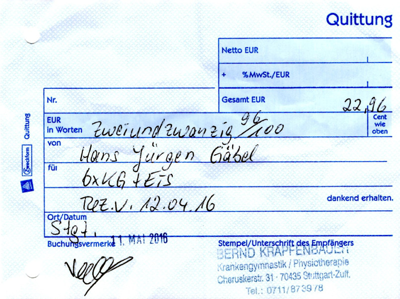 | Zuzahlungsrechnung vom 27. April 2016  Heilmittelverordnung für Krankengymnastik vom 12. April 2016  Gebührenquittung für Krankengymnastik vom 11. Mai 2016  Schreiben AOK vom 28. Juni 2016 wegen Krankentransportwagen    Schreiben Deutsche Rentenversicherung betreffend "Rentenanpassung zum 01.07.2016"      Betriebskostenabrechnung vom 14. Oktober 2016            |