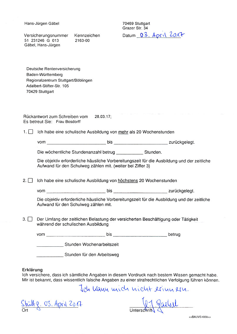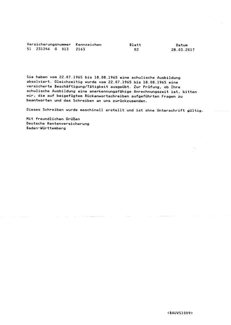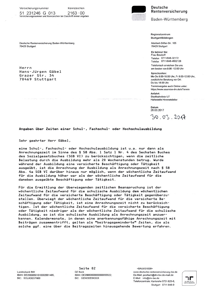 | Schreiben der Rentenversicherung vom 28. März 2017 wegen Ausbildungszeit   Rückantwort an die Rentenversicherung vom 03. April 2017  Rentenbescheid vom 26. April 2017 (32 Seiten) + Merkblatt (2 Seiten)                                   |
