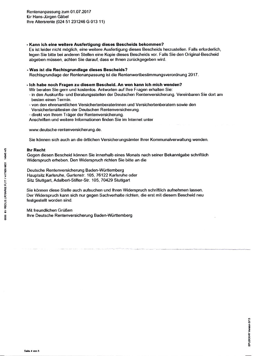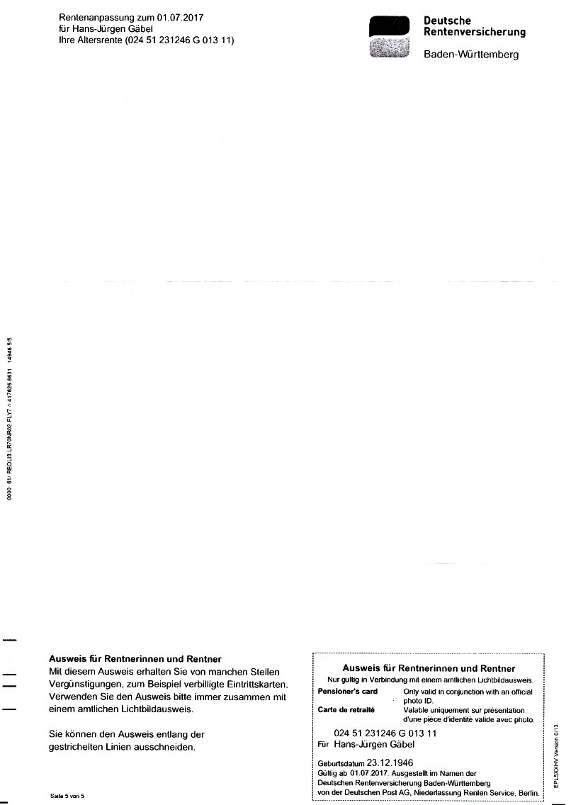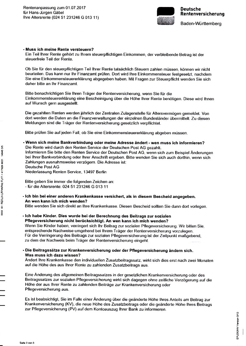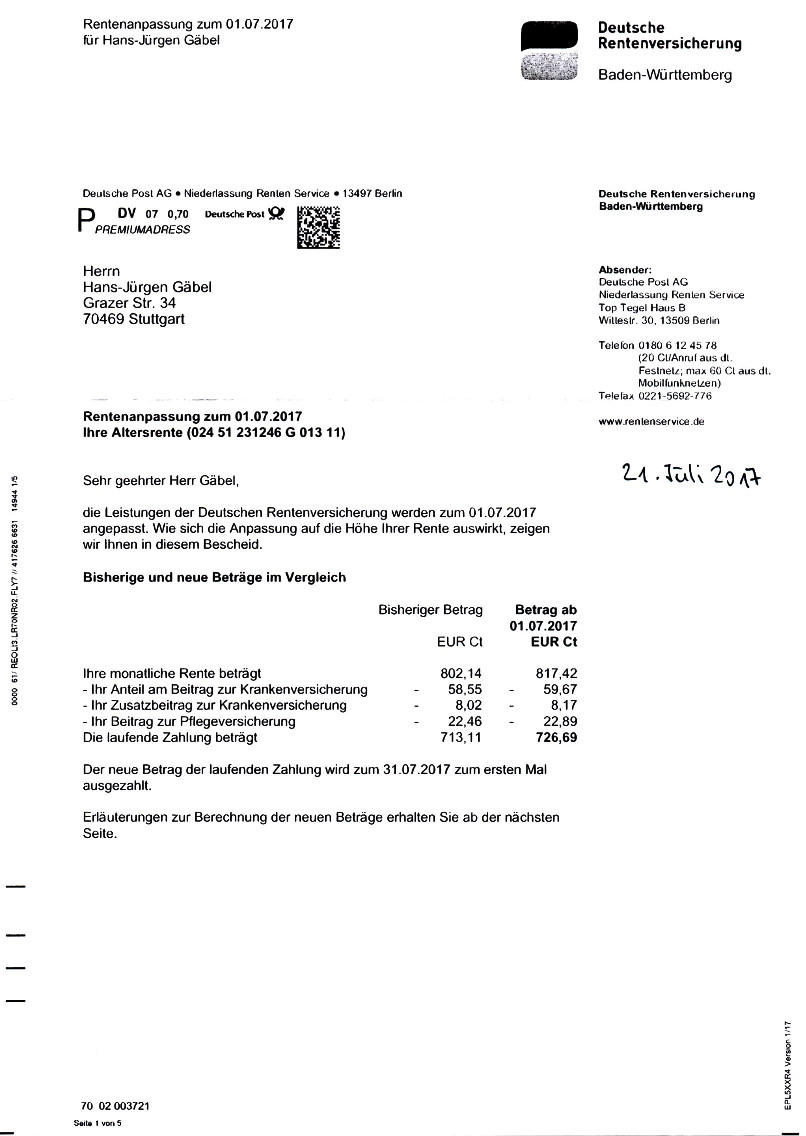 | Kontoauszug mit Überweisung (27.06.2017) der Grundsicherung für Juli 2017  Schreiben vom 05.07.2017 wegen Kürzung der Grundsicherung aufgrund Rentenerhöhung zum 01.07.2017 (4 Seiten)     Bescheid über die Rentenerhöhung zum 01.07.2017 (5 Seiten)      Schreiben Bezirksrathaus Feuerbach vom 20. Februar 2019  Grundsicherung-Weiterbewilligungsantrag vom 20. Februar 2019 (12 Blatt)             |