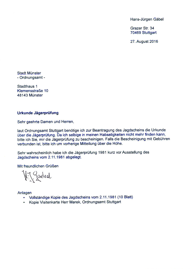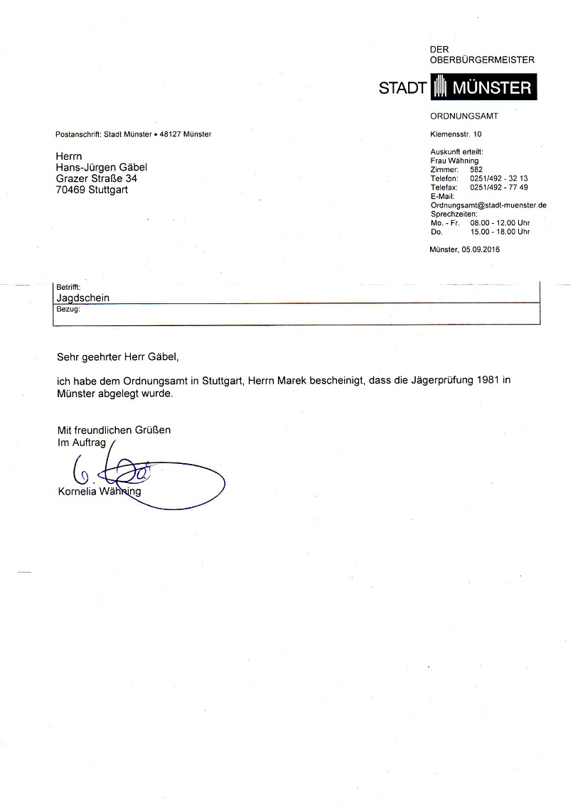 | Antrag auf Jagdschein   Antrag auf Waffenschein bzw. Waffenbesitzkarte     Schreiben an das Ordnungsamt Münster vom 27. August 2016 wegen Urkunde Jägerprüfung  Schreiben Ordnungsamt Münster vom 05.09.2016 wegen Jägerprüfung  |