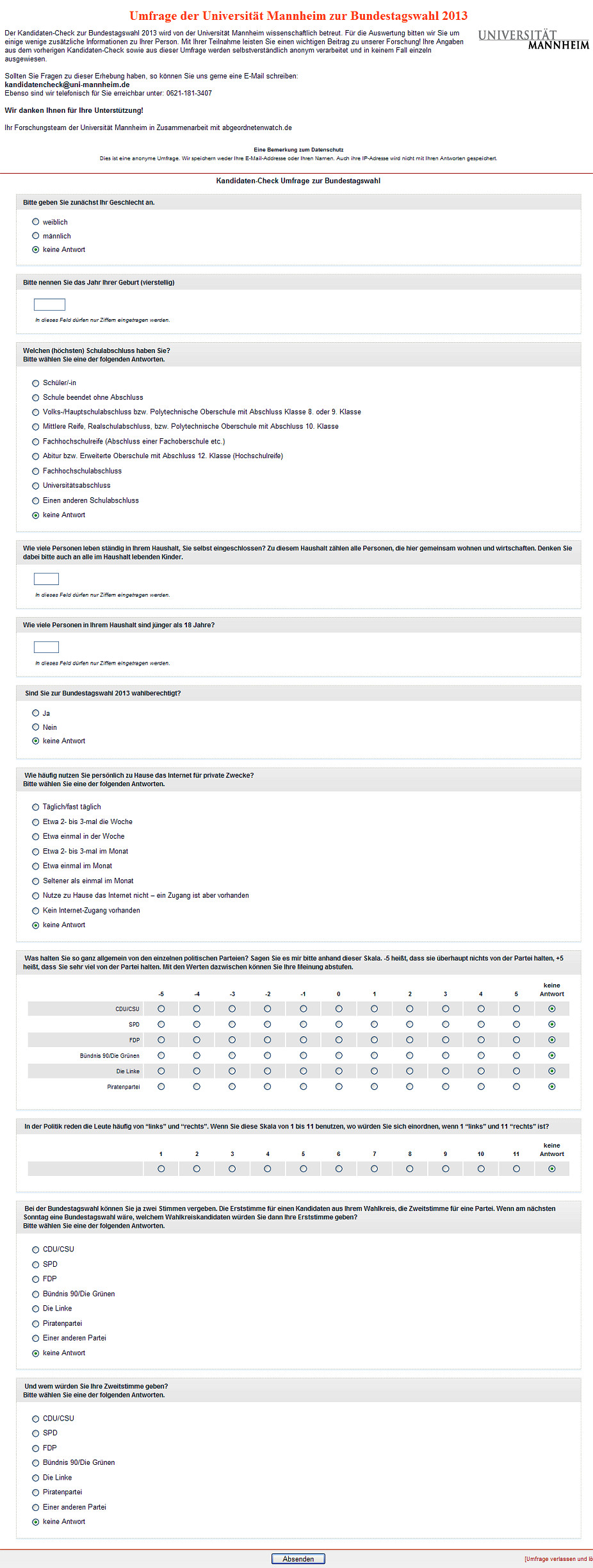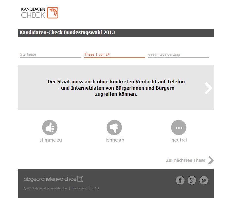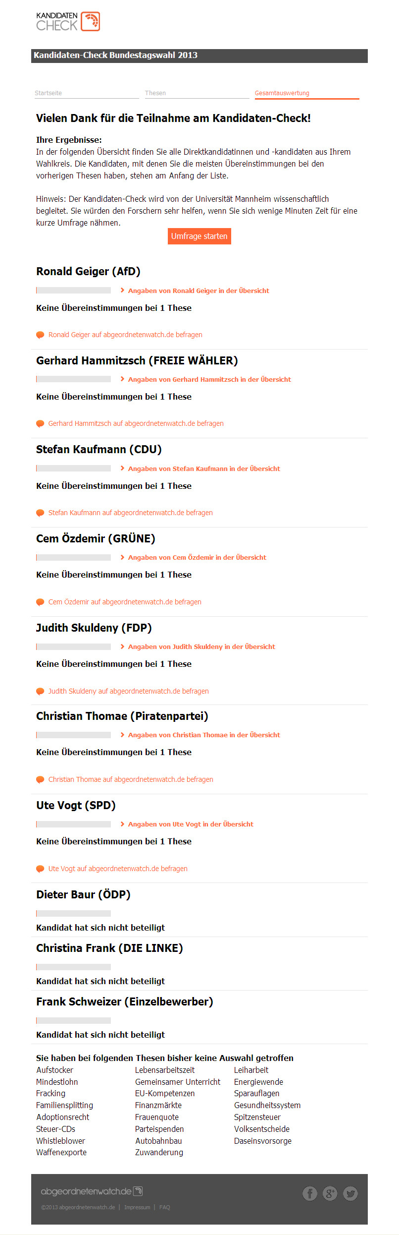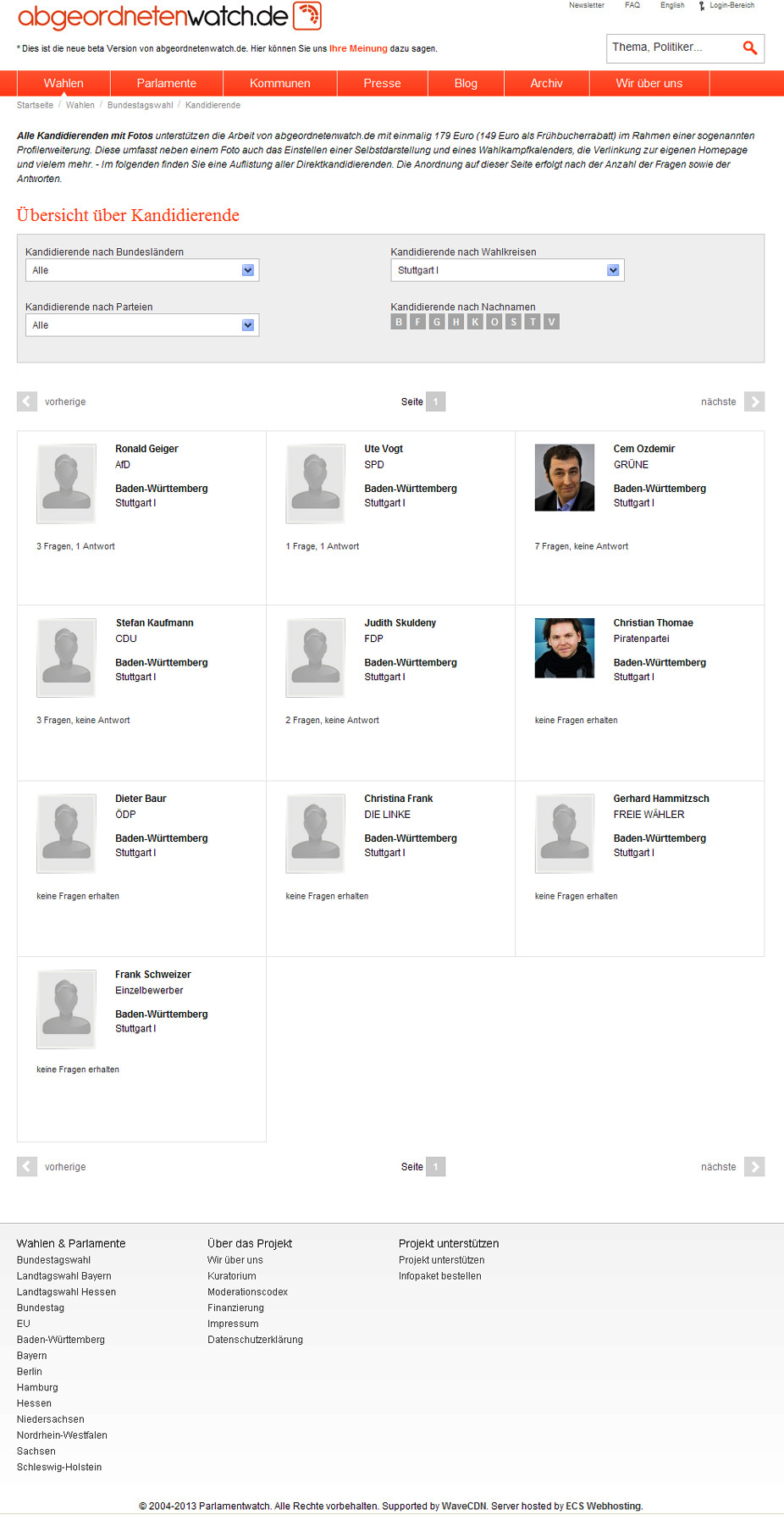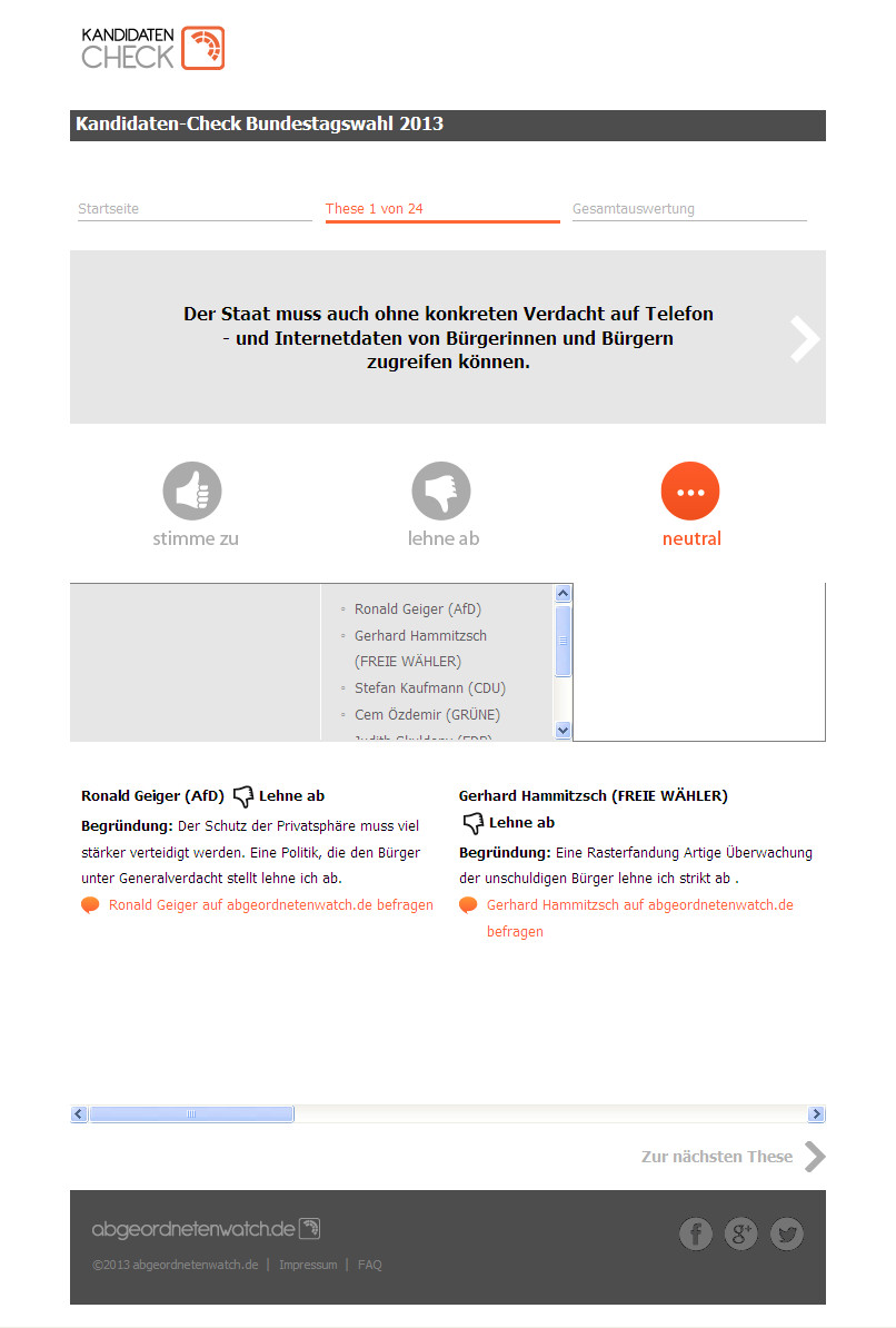 | Das Portal "abgeordnetenwatch.de" hat schon mal eine Vorauswahl getroffen, welche Kandidaten am "demokratischen Wettbewerb" teilnehmen dürfen und welche nicht. |