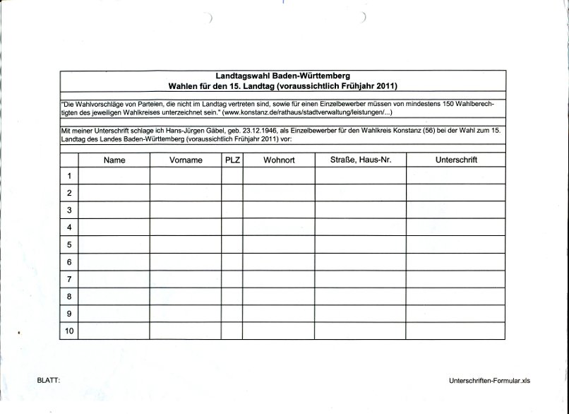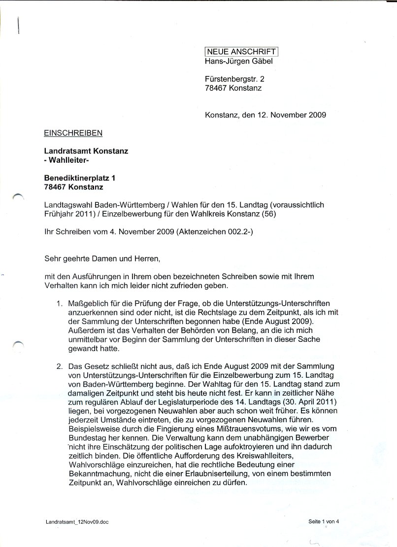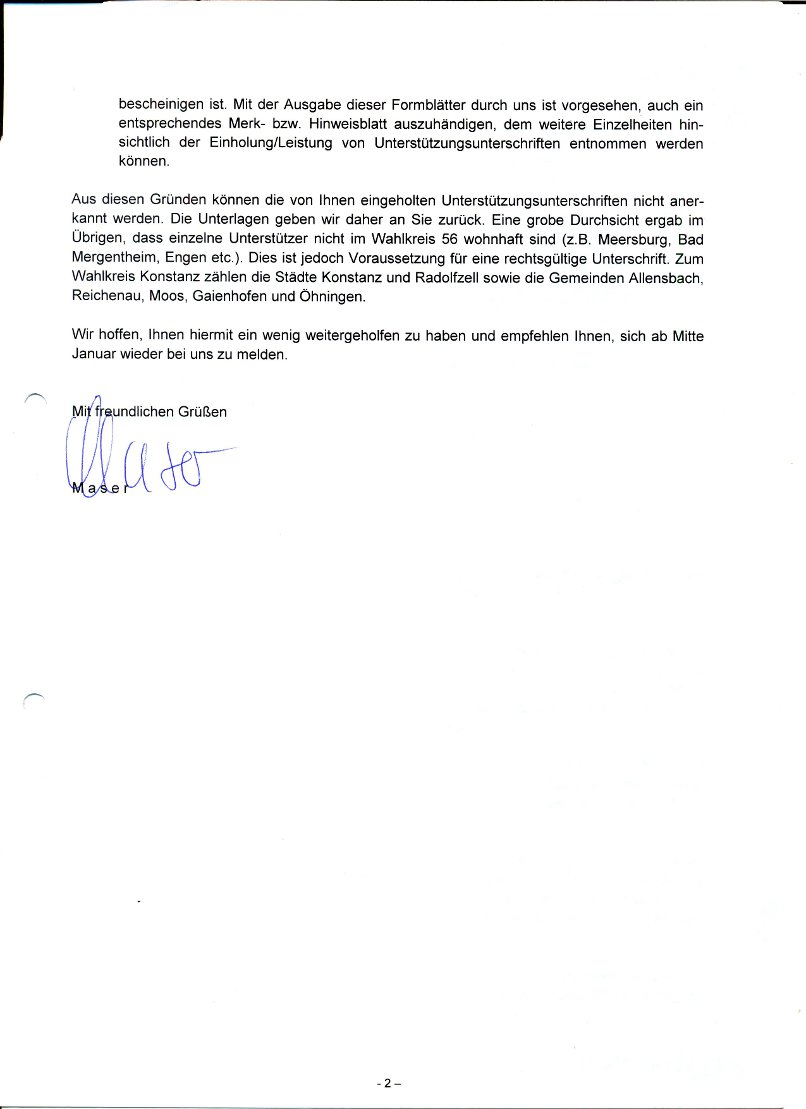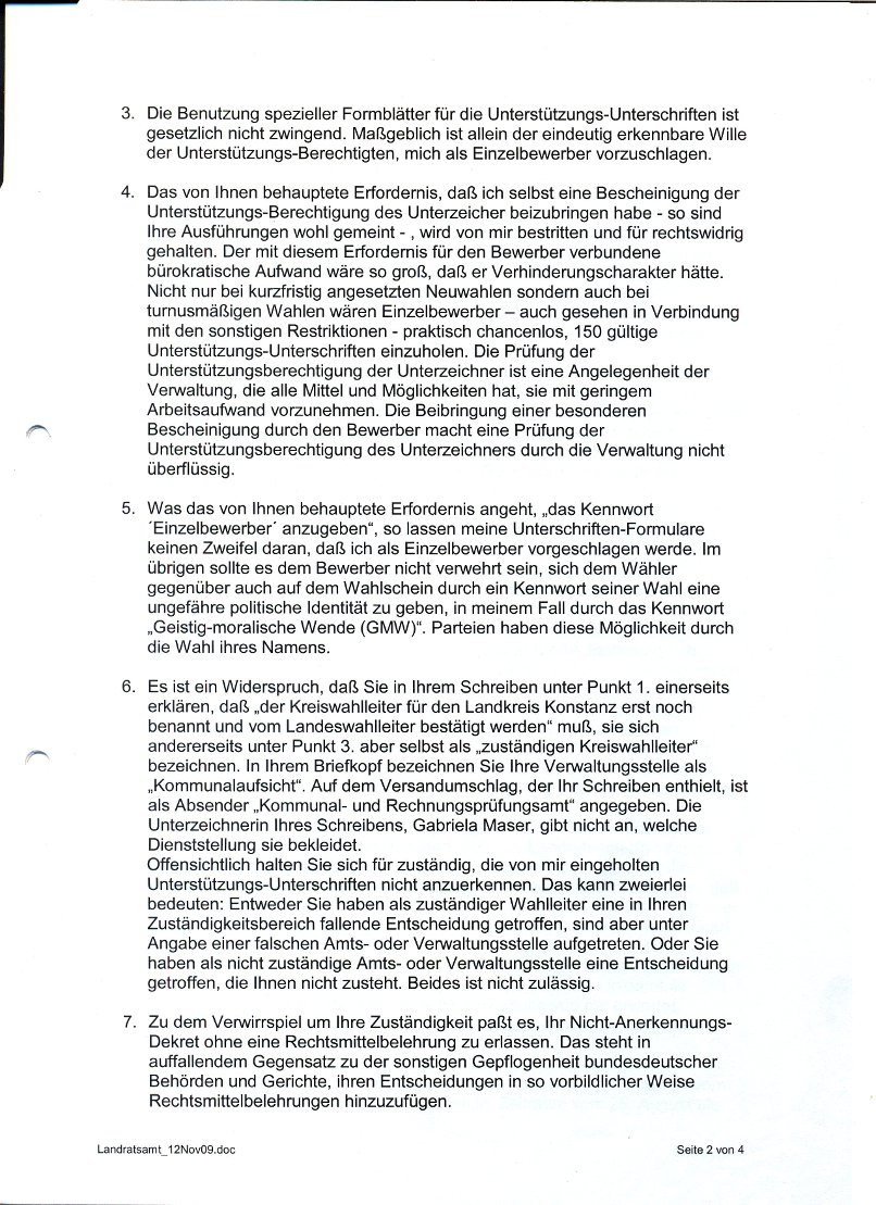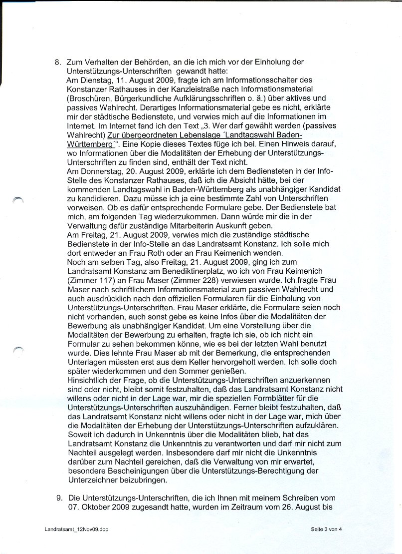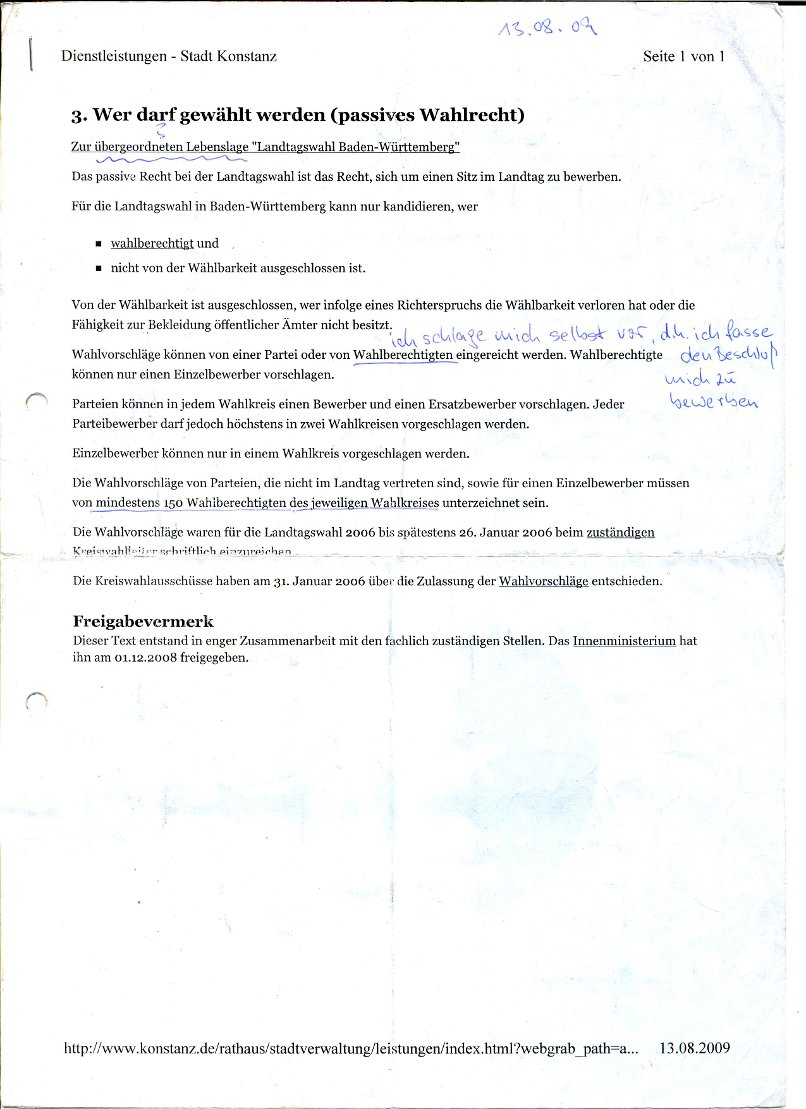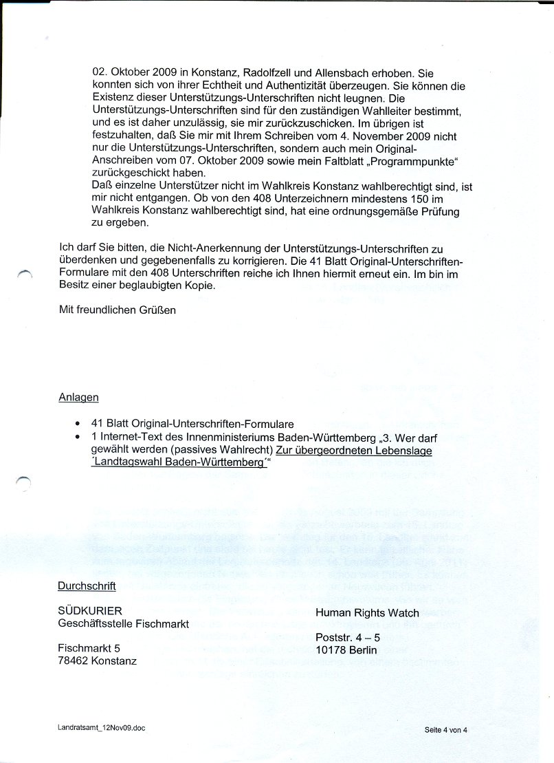 Schreiben an das Landratsamt Konstanz vom 07. Oktober 2009![]() Schreiben des Landratsamts Konstanz vom 04. November 2009 ![]() ![]() ![]() Schreiben an das Landratsamt Konstanz vom 12. November 2009 ![]() ![]() ![]() ![]() Schreiben an den SÜDKURIER vom 12. November 2009 ![]() Internet-Text des Innenministeriums Baden-Württemberg "3. Wer darf gewählt werden ..." ![]() Unterschriften-Formular (Das Datum der Unterschrift wurde von mir jeweils handschriftlich hinzugefügt) ![]() |