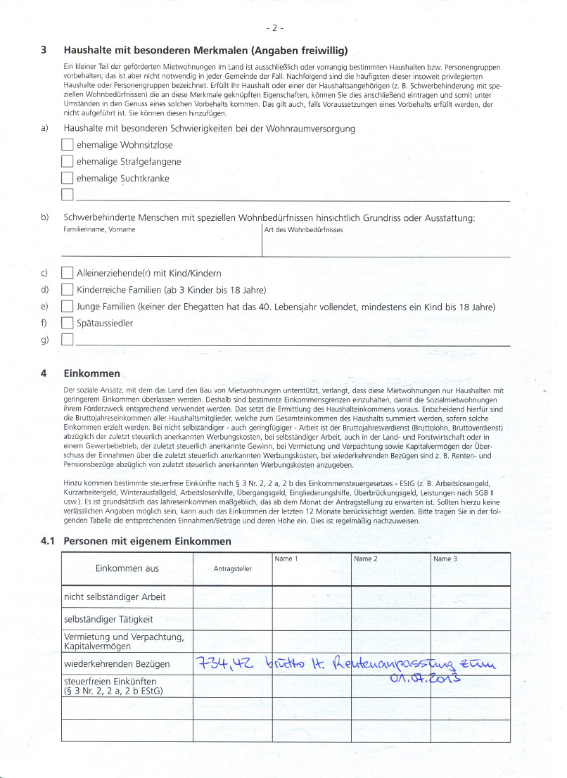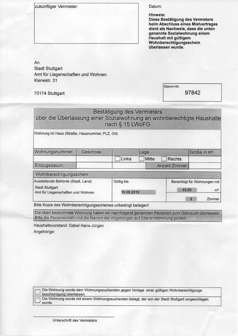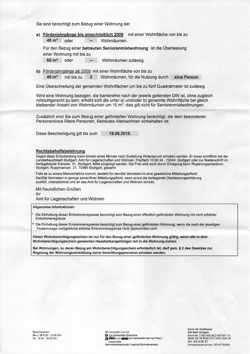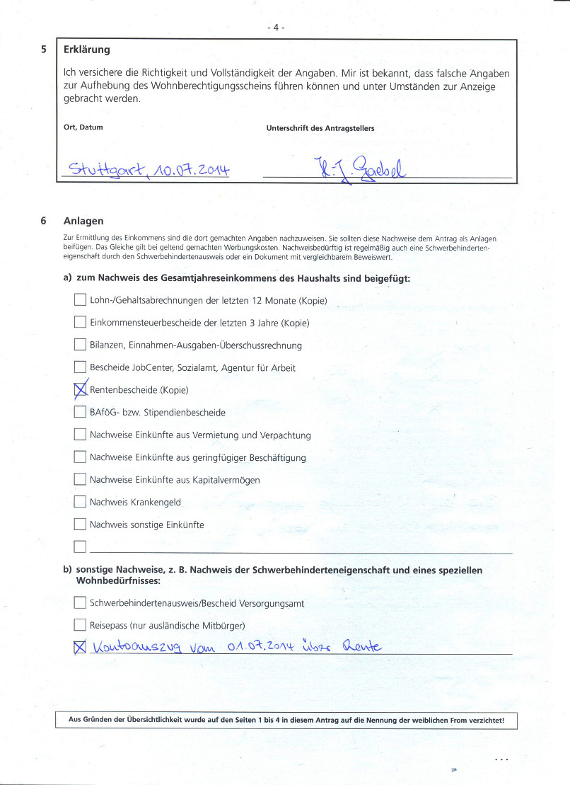 Antrag auf Wohnberechtigungsschein vom 10. Juli 2014![]() ![]() ![]() ![]() ![]() ![]() ![]() Kontoauszug vom 01.07.2014 über die Rentenzahlung ![]() Schreiben Liegenschaftsamt vom 19. August 2014 betreffend Vormerkdatei für Wohnung ![]() ![]() ![]() Wohnberechtigungsschein für 2014/2015 vom 19. August 2014 ![]() ![]() ![]() |