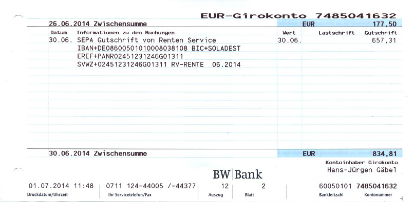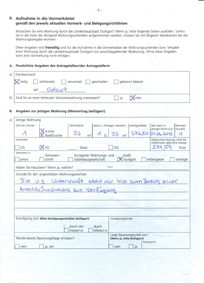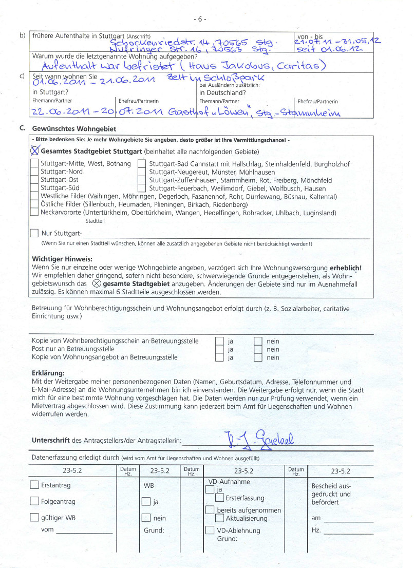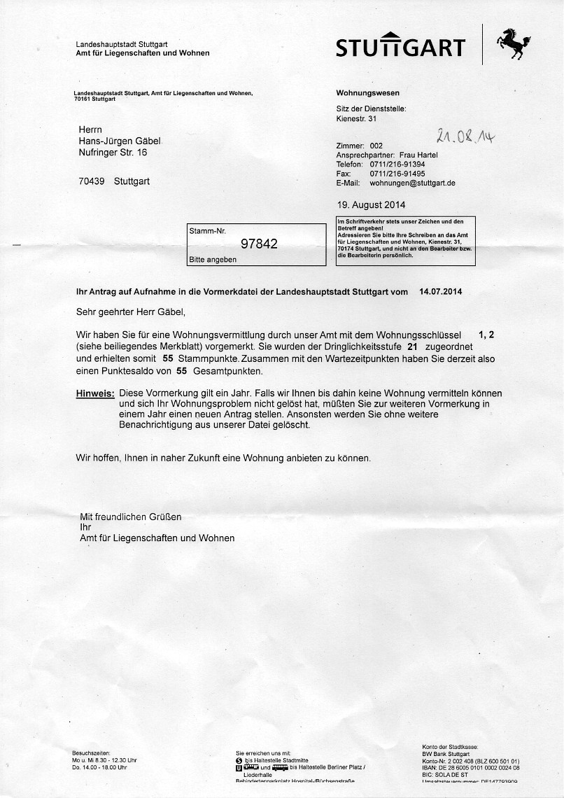 Antrag auf Wohnberechtigungsschein vom 10. Juli 2014![]() ![]() ![]() ![]() ![]() ![]() ![]() Kontoauszug vom 01.07.2014 über die Rentenzahlung ![]() Schreiben Liegenschaftsamt vom 19. August 2014 betreffend Vormerkdatei für Wohnung ![]() ![]() ![]() Wohnberechtigungsschein für 2014/2015 vom 19. August 2014 ![]() ![]() ![]() |