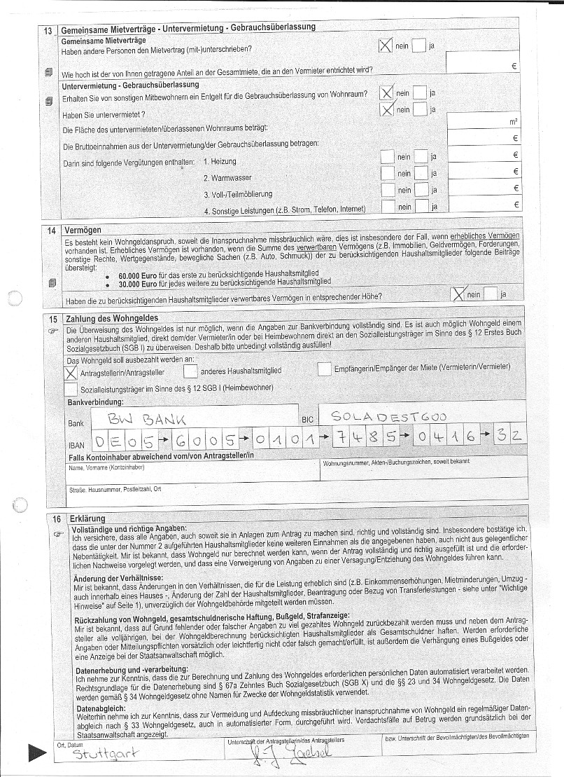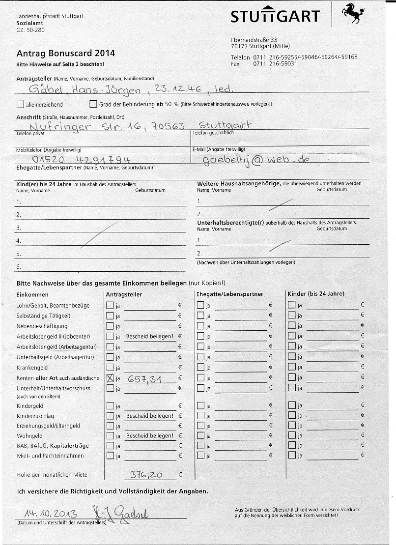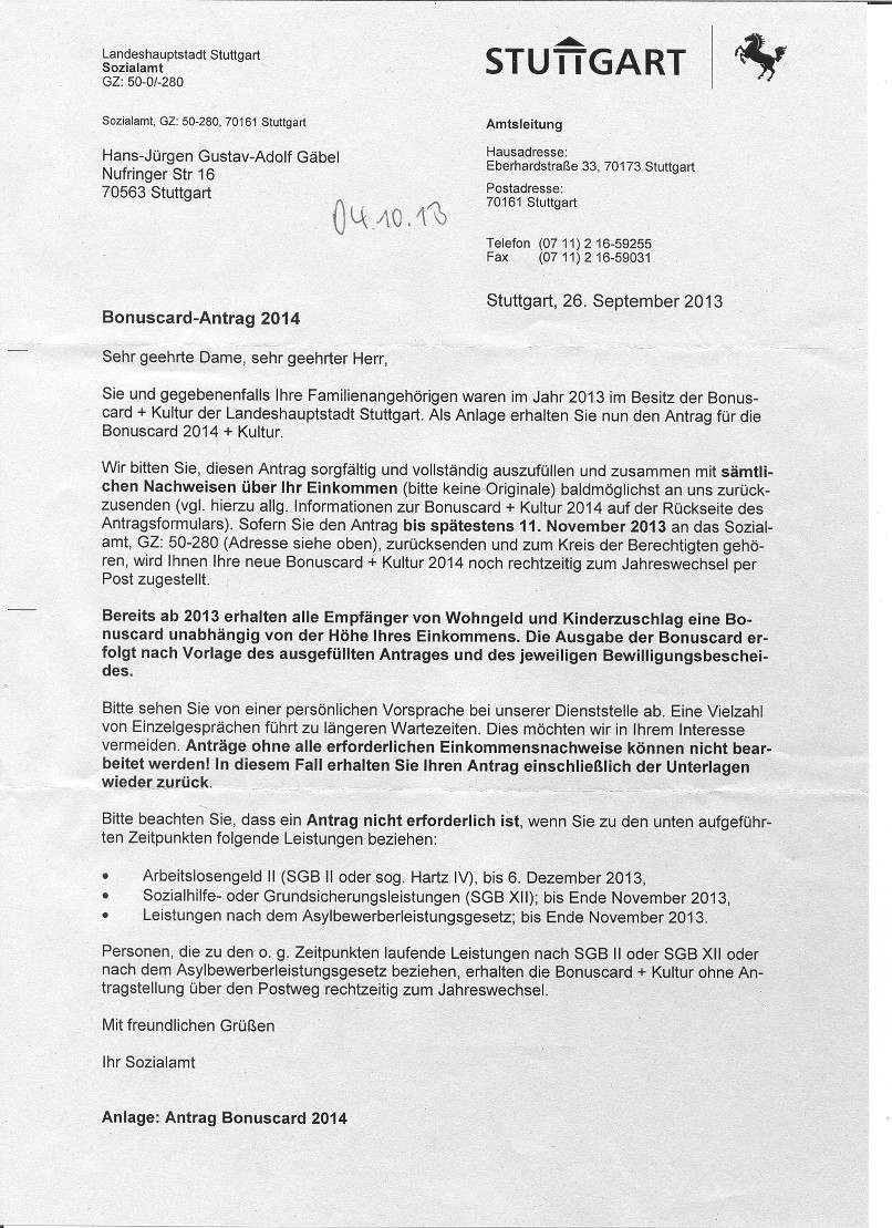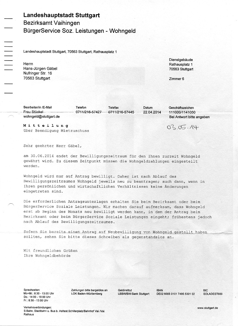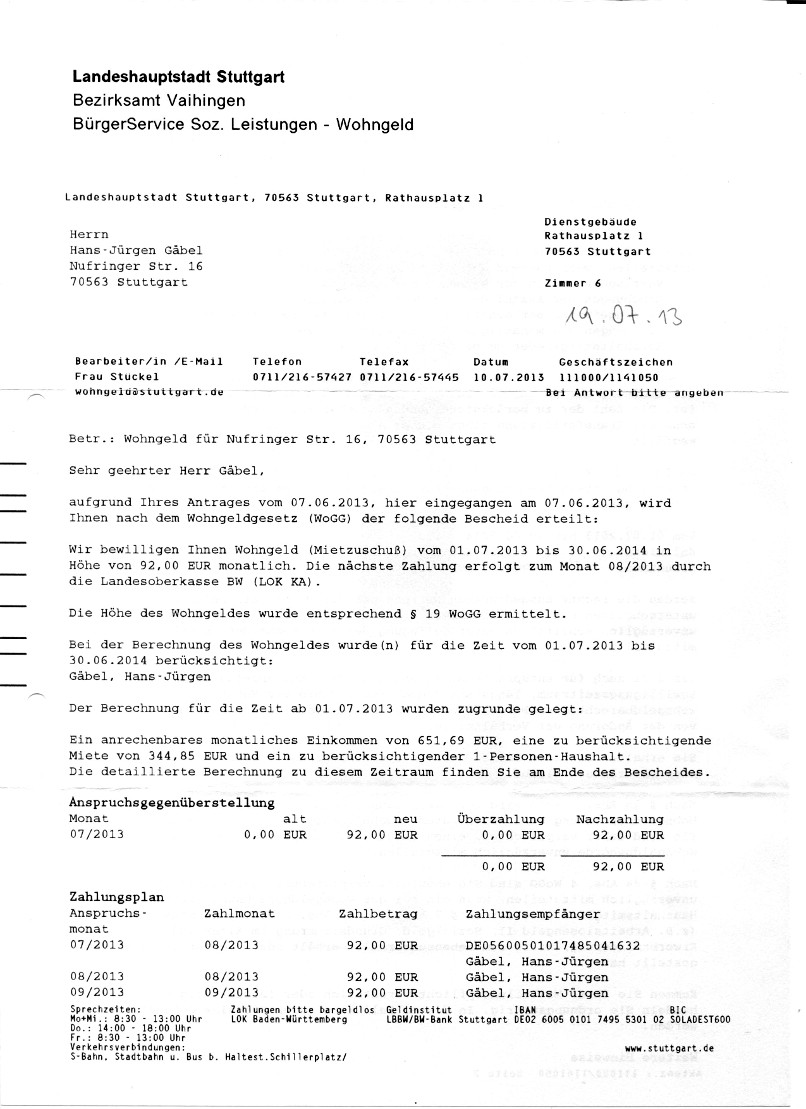 Wohngeldbescheid vom 10. Juli 2013![]() ![]() ![]() ![]() ![]() Schreiben der Stadt Stuttgart vom 26. September 2013 ![]() Antrag auf "Bonuscard 2014" ![]() ![]() Bonuscard 2014 ![]() ![]() ![]() Schreiben Bezirksamt Vaihingen vom 22.04.2014 ![]() Antrag auf Wohngeld vom 15. Mai 2014 ![]() ![]() ![]() ![]() ![]() Kontoauszug vom 08. Mai 2014 ![]() |