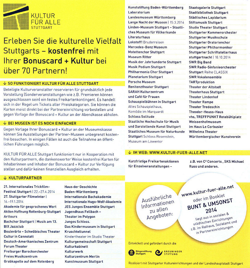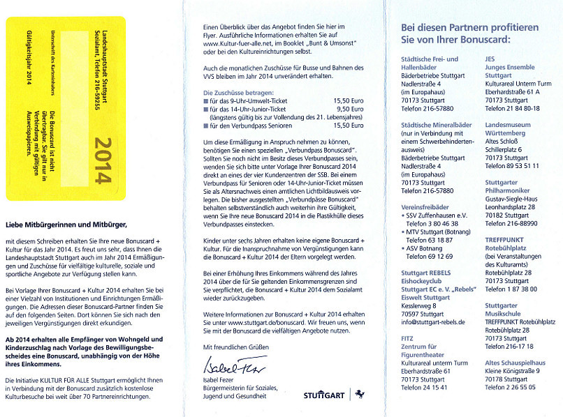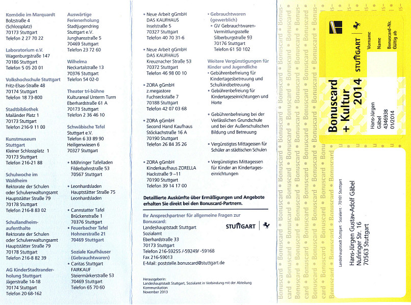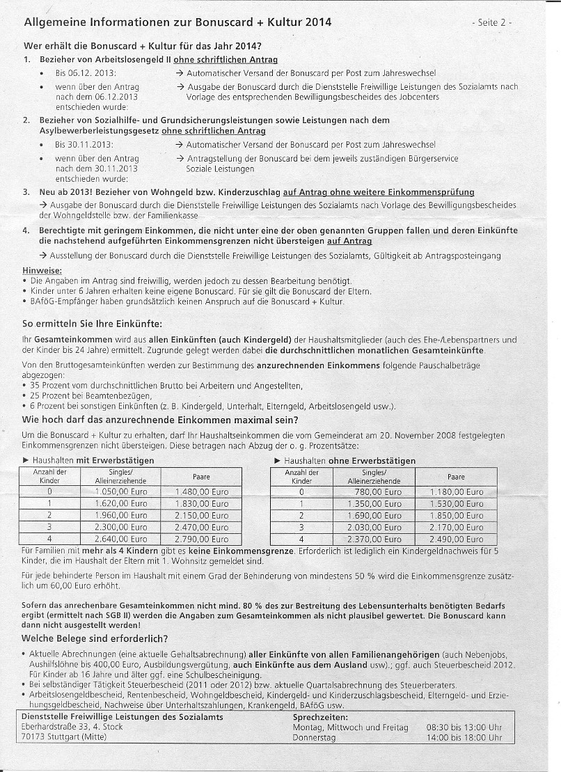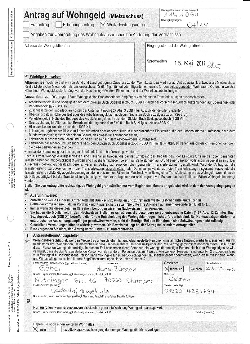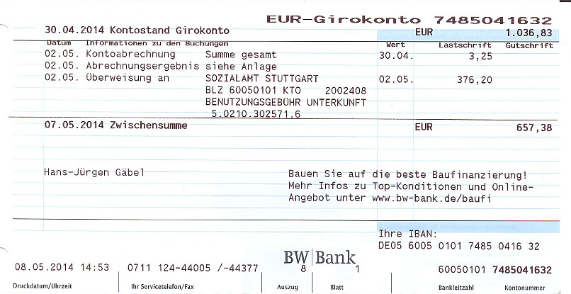 Wohngeldbescheid vom 10. Juli 2013![]() ![]() ![]() ![]() ![]() Schreiben der Stadt Stuttgart vom 26. September 2013 ![]() Antrag auf "Bonuscard 2014" ![]() ![]() Bonuscard 2014 ![]() ![]() ![]() Schreiben Bezirksamt Vaihingen vom 22.04.2014 ![]() Antrag auf Wohngeld vom 15. Mai 2014 ![]() ![]() ![]() ![]() ![]() Kontoauszug vom 08. Mai 2014 ![]() |