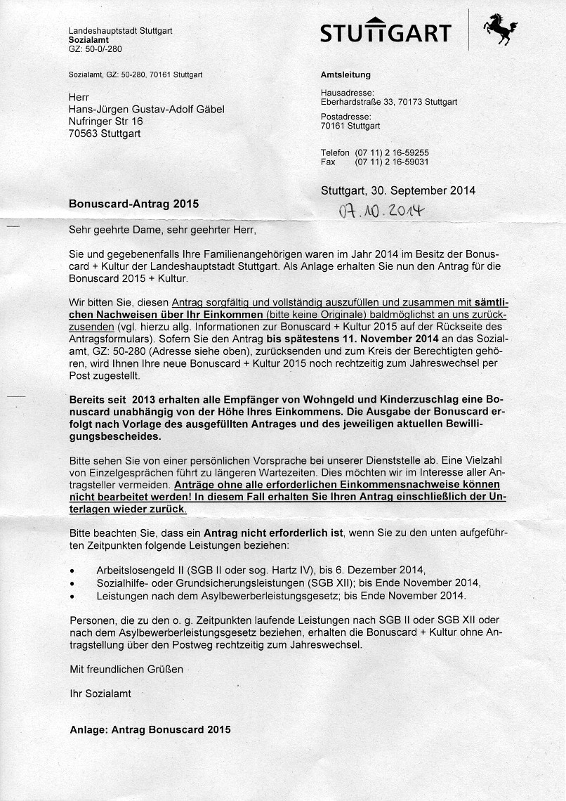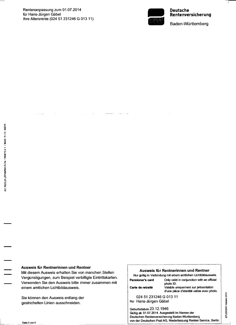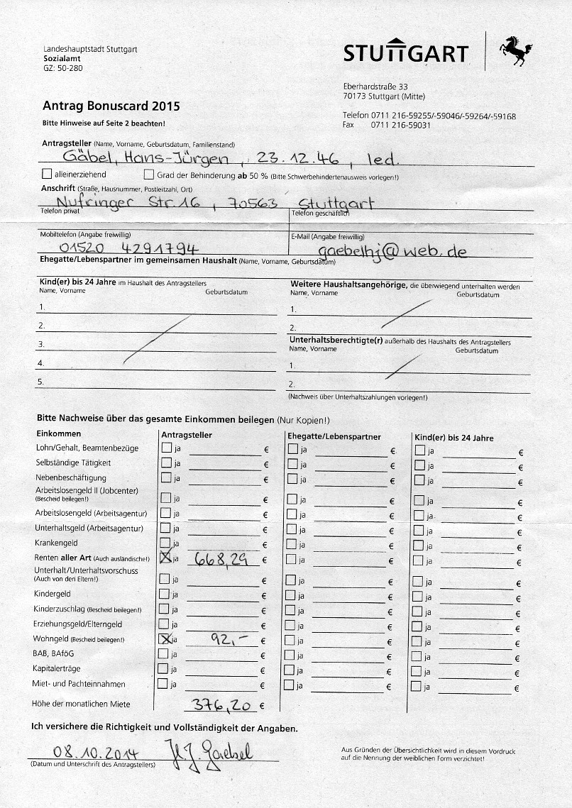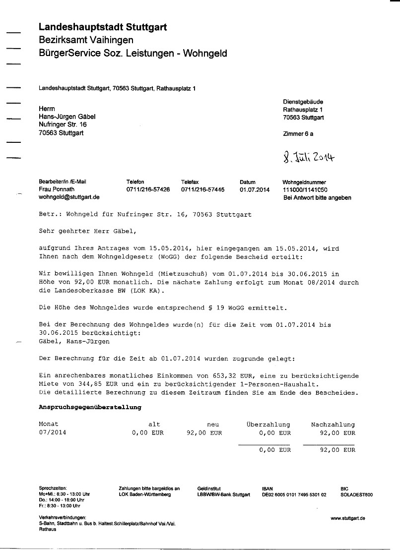 Wohngeldbescheid vom 01. Juli 2014![]() ![]() ![]() ![]() ![]() Schreiben Deutsche Rentenversicherung betreffend "Rentenanpassung zum 01.07.2014" ![]() ![]() ![]() ![]() ![]() Schreiben der Stadt Stuttgart vom 30. September 2014 ![]() Antrag auf "Bonuscard 2015" ![]() ![]() Wohngeldantrag vom 05. November 2014 ![]() ![]() ![]() Fortsetzung Wohngeldantrag vom 05. November 2014 Nächste Seite |