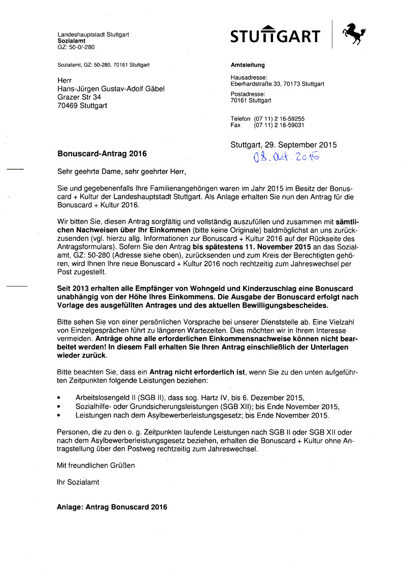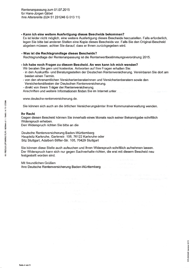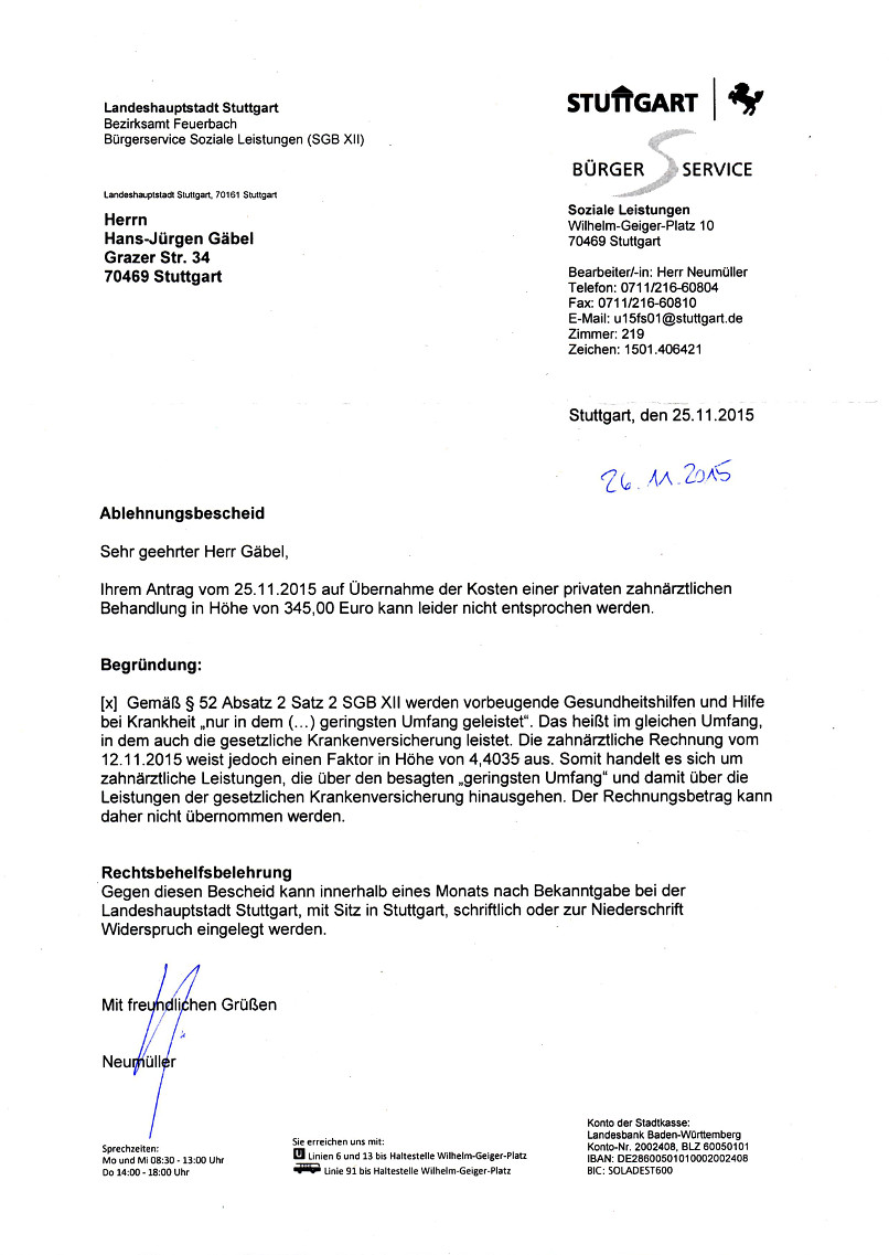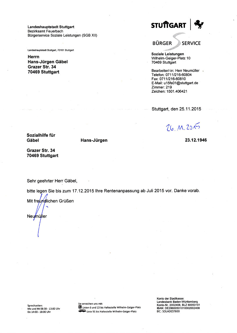 Schreiben Deutsche Rentenversicherung betreffend "Rentenanpassung zum 01.07.2015"![]() ![]() ![]() ![]() ![]() Schreiben EnBW vom 23. September 2015 ![]() Schreiben Sozialamt vom 29. September 2015 ![]() ![]() ![]() Rechnung Zahnarzt D. Schulz vom 12. November 2015 ![]() ![]() Ablehnungsbescheid vom 25. November 2015 ![]() Schreiben Bezirksamt Feuerbach vom 25. November 2015 wegen Rentenanpassung ab Juli 2015 ![]() Bonuscard 2016 ![]() ![]()