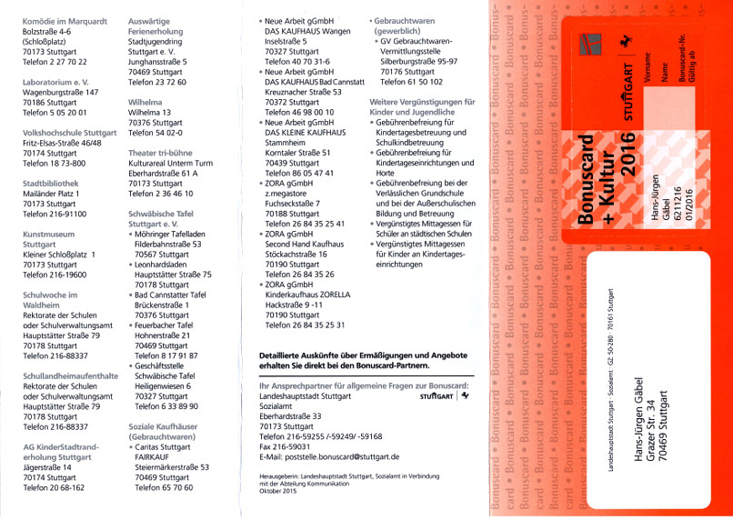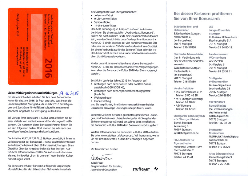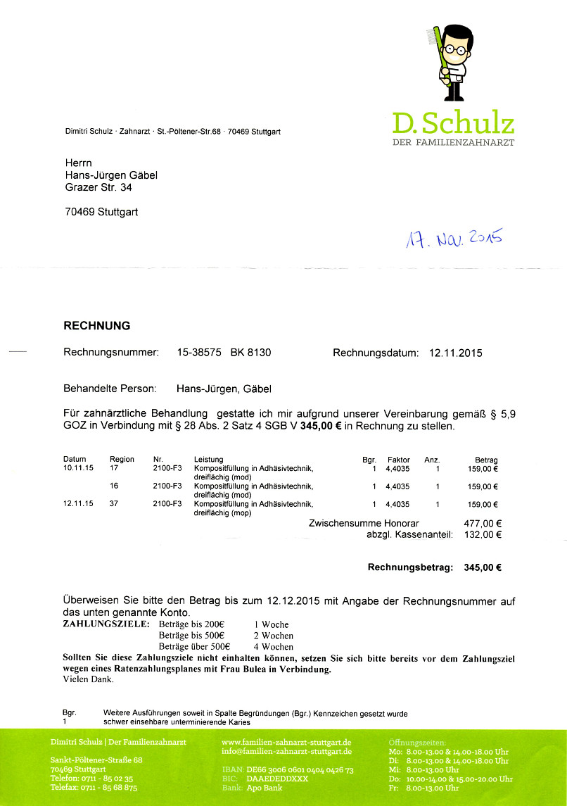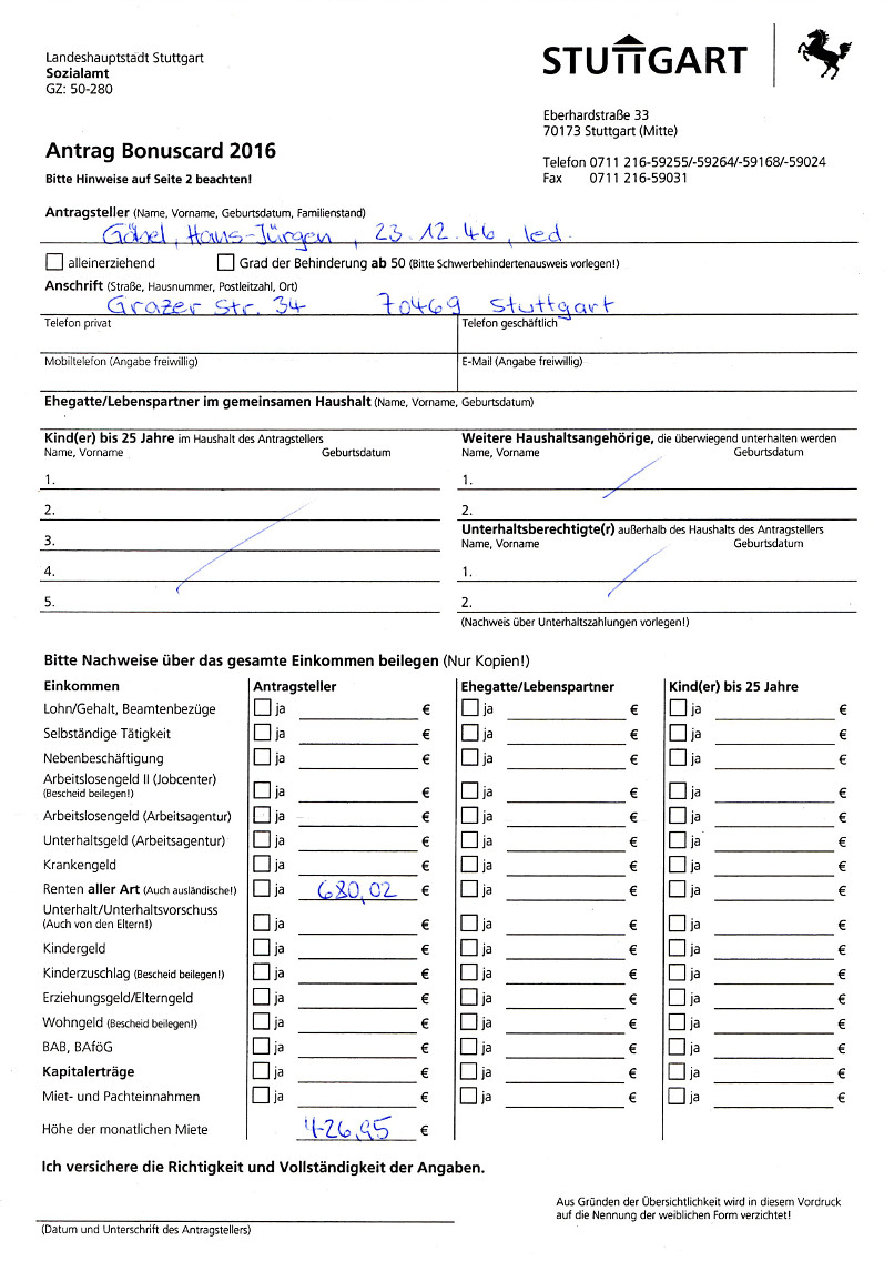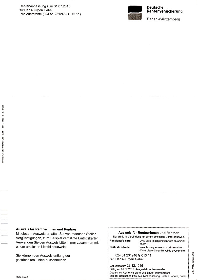 Schreiben Deutsche Rentenversicherung betreffend "Rentenanpassung zum 01.07.2015"![]() ![]() ![]() ![]() ![]() Schreiben EnBW vom 23. September 2015 ![]() Schreiben Sozialamt vom 29. September 2015 ![]() ![]() ![]() Rechnung Zahnarzt D. Schulz vom 12. November 2015 ![]() ![]() Ablehnungsbescheid vom 25. November 2015 ![]() Schreiben Bezirksamt Feuerbach vom 25. November 2015 wegen Rentenanpassung ab Juli 2015 ![]() Bonuscard 2016 ![]() ![]()