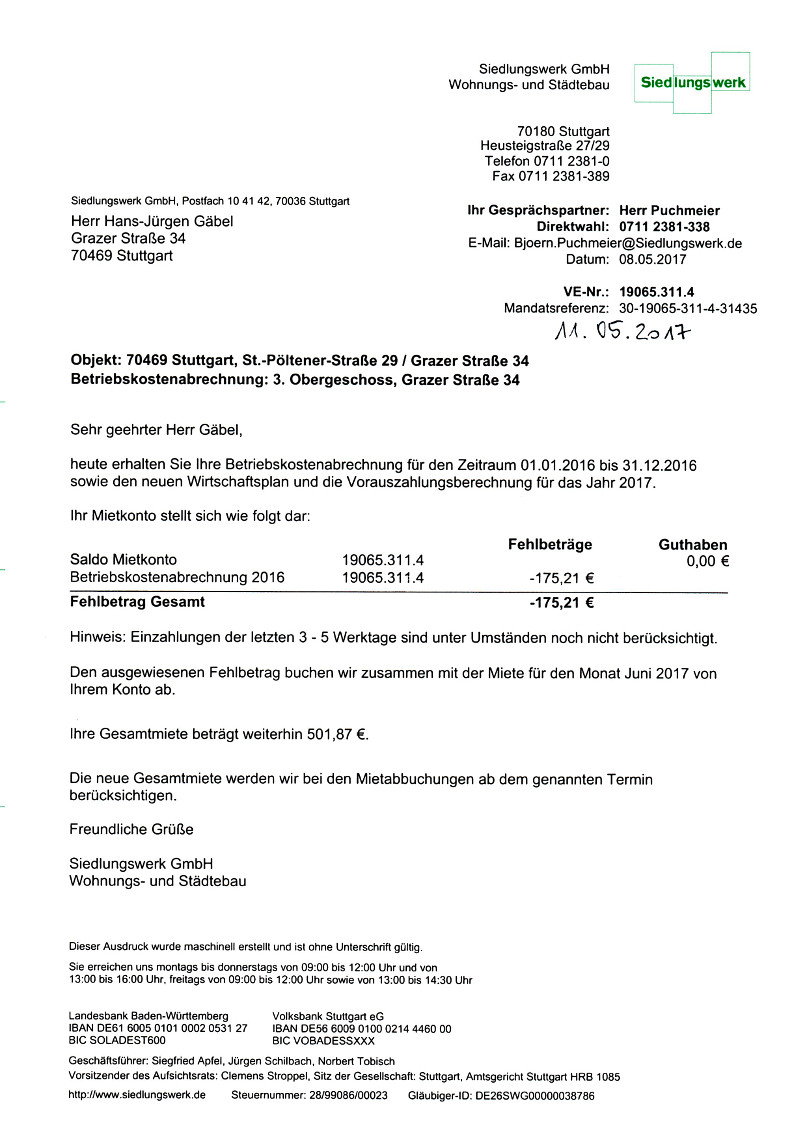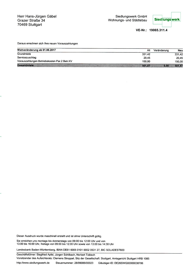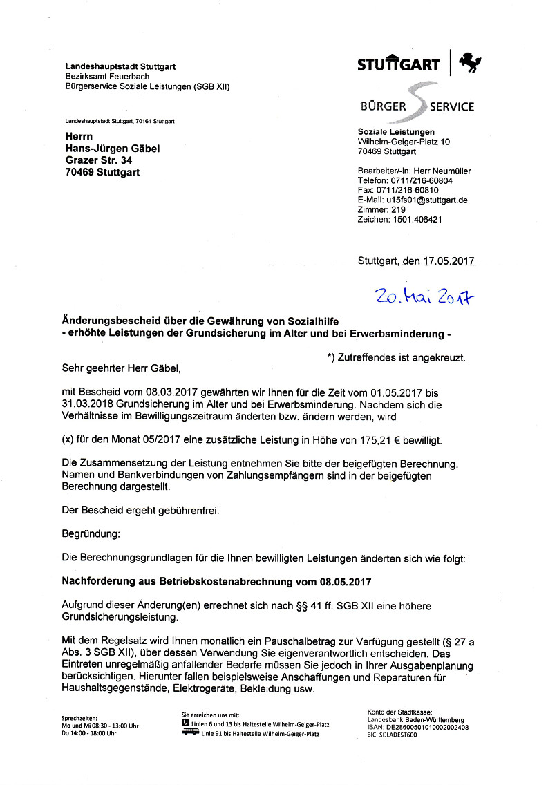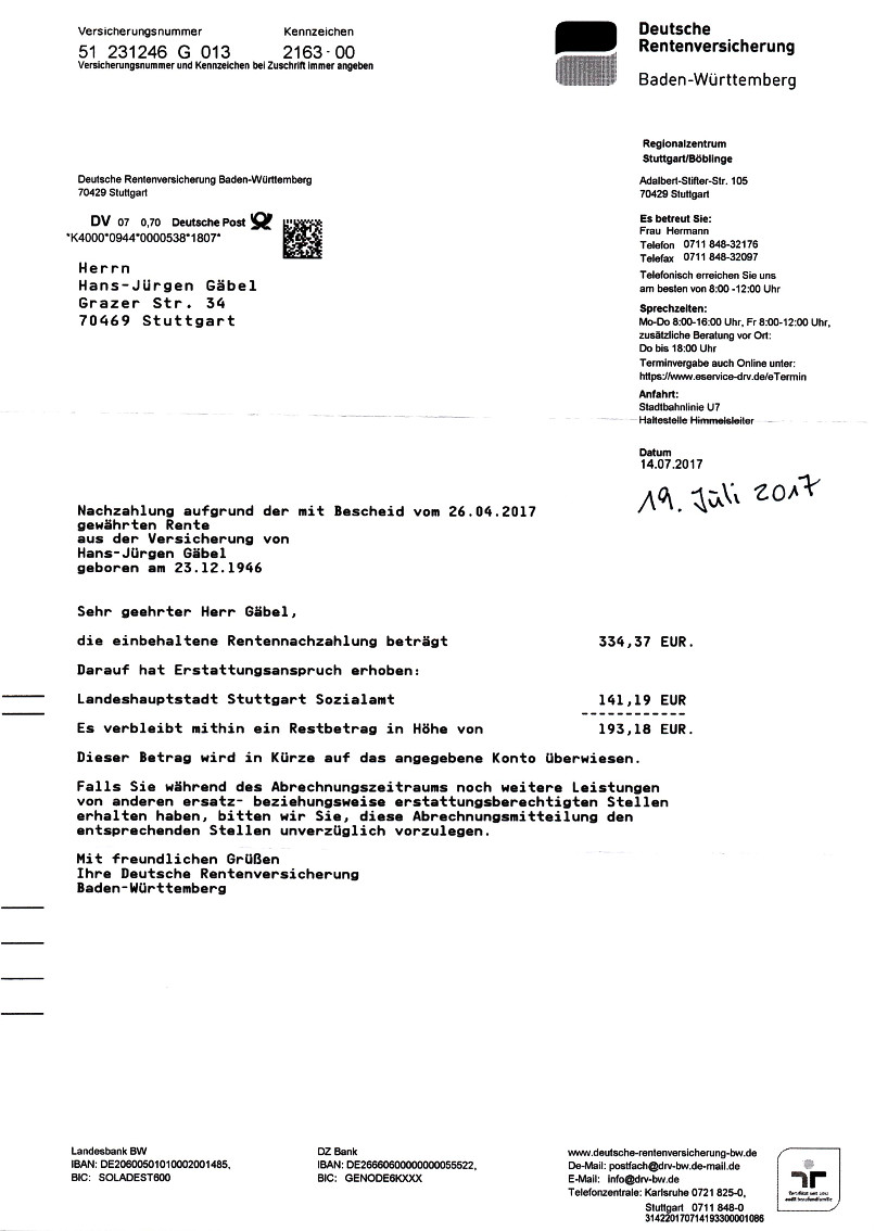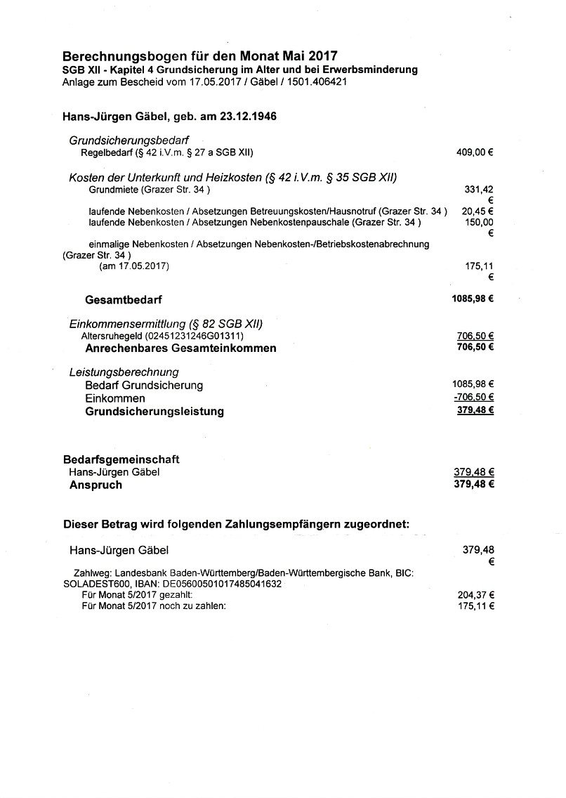 Schreiben Siedlungswerk Stuttgart vom 08. Mai 2017 wegen Betriebskostenabrechnung 2016 (11 Blatt)![]() ![]() ![]() ![]() ![]() ![]() ![]() ![]() ![]() ![]() ![]() Änderungsbescheid wegen Grundsicherung vom 17. Mai 2017 (4 Seiten) ![]() ![]() ![]() ![]() Schreiben Rentenversicherung vom 14. Juli 2017 wegen Nachzahlung ![]() |