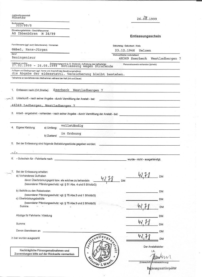 | Am Donnerstag, 26. August 1999, beim Wecken, sagte der Wärter "Packen". Im Zuge des Check-Out-Prozederes erhielt ich vom "Leiter der Vollzugsabteilung", Herrn Krabbe, den "Entlassungsschein". Er meinte es sei einmalig, daß jemand ein volles halbes Jahr Erzwingungshaft absitze. Ich: "Einmal ist immer das erste Mal." |