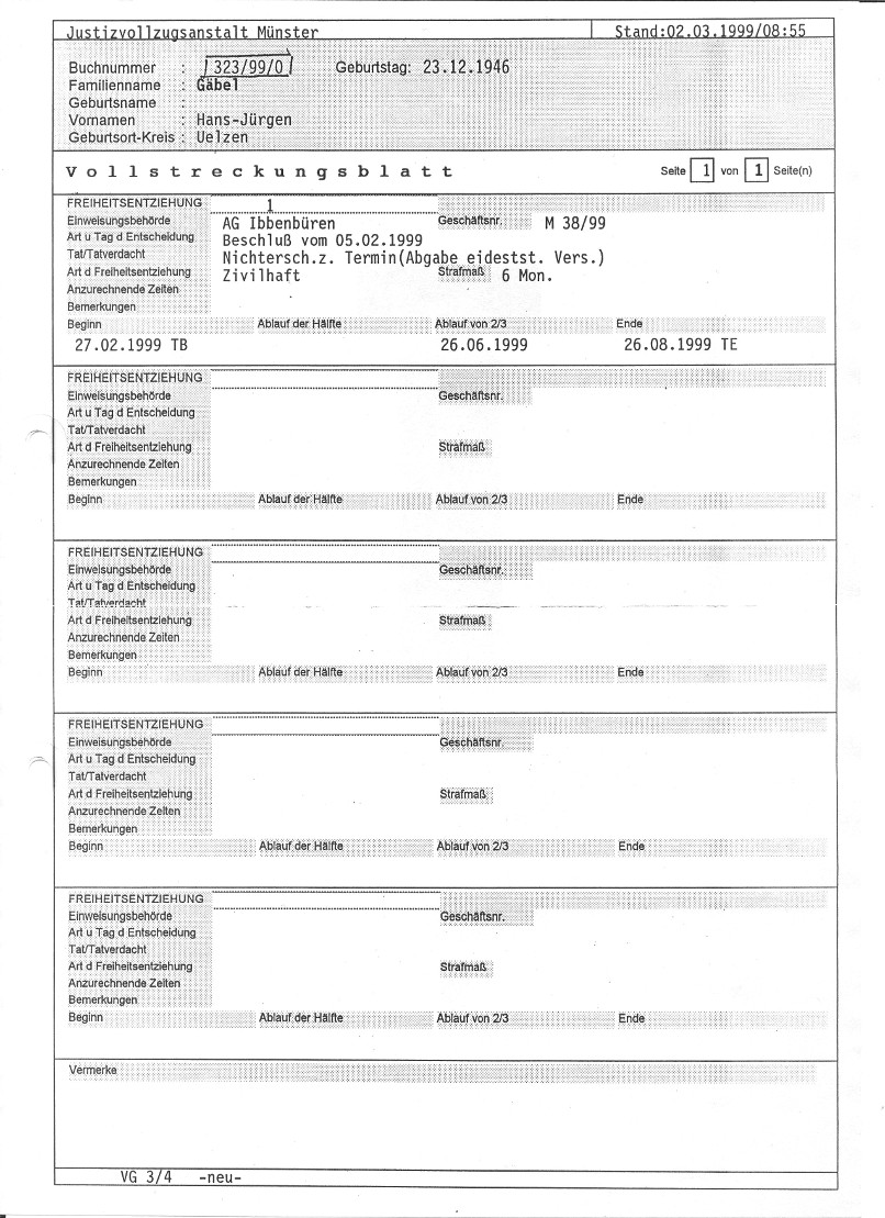 Am Samstag, 27. Februar 1999, vormittags, stand der Obergerichtsvollzieher Hülsmeier aus Ibbenbüren in Begleitung zweier Polizisten vor meiner Wohnungstür im münsterländischen Saerbeck-Westladbergen, um mich zu verhaften. Ich folgte seiner Aufforderung mitzukommen nicht, sondern setzte mich zum Zeichen der Weigerung in meinen Sessel. Die Polizisten legten mir gewaltsam Handschellen an - Hände auf dem Rücken. Dann wurde ich ohne weitere Umstände in den PKW des Obergerichtsvollziehers Hülsmeier verfrachtet. Dieser fuhr mich in Begleitung eines der Polizisten zur JVA Münster in der Gartenstraße, wo ich für das nächste halbe Jahr eingesperrt wurde. Während des Transports in die JVA blieben die Handschellen angelegt, was schmerzhaft war. Am Dienstag nach meiner Einlieferung wurde mir von dem Justizbeamten Evers die Frage gestellt, ob ich bereit sei, die eidesstattliche Erklärung abzugeben. Meine Antwort: Nein. Er gab mir zu verstehen, daß ich mich melden sollte, falls ich meine Meinung geändert hätte. Man sei da flexibel. Daraufhin stellte er das "Vollstreckungsblatt" aus. Auf meine Einlassung, daß ich noch keinen Haftbefehl gesehen hätte, erklärte er, er wolle mir aus seinen Unterlagen eine Kopie machen. Dies geschah jedoch nicht, so daß ich bis heute nicht den Namen der Person kenne, die die Haft angeordnet hat. |