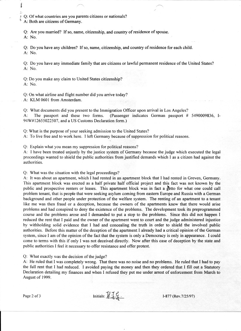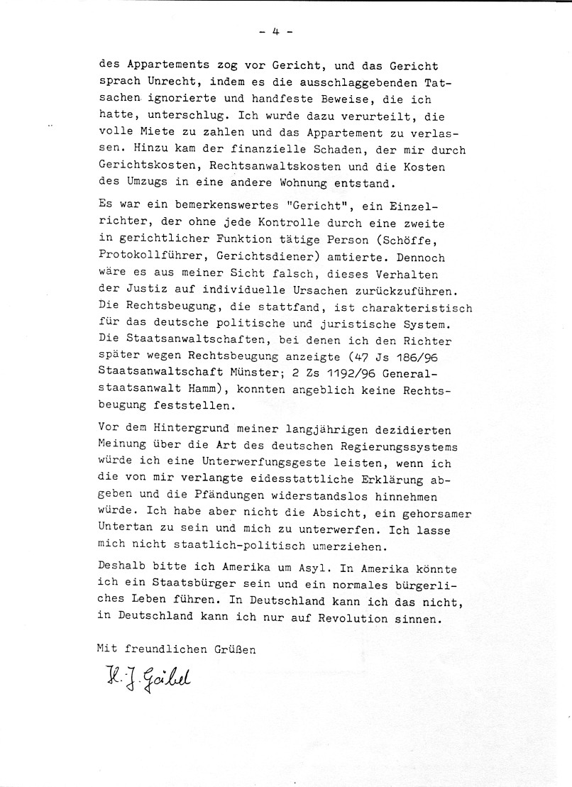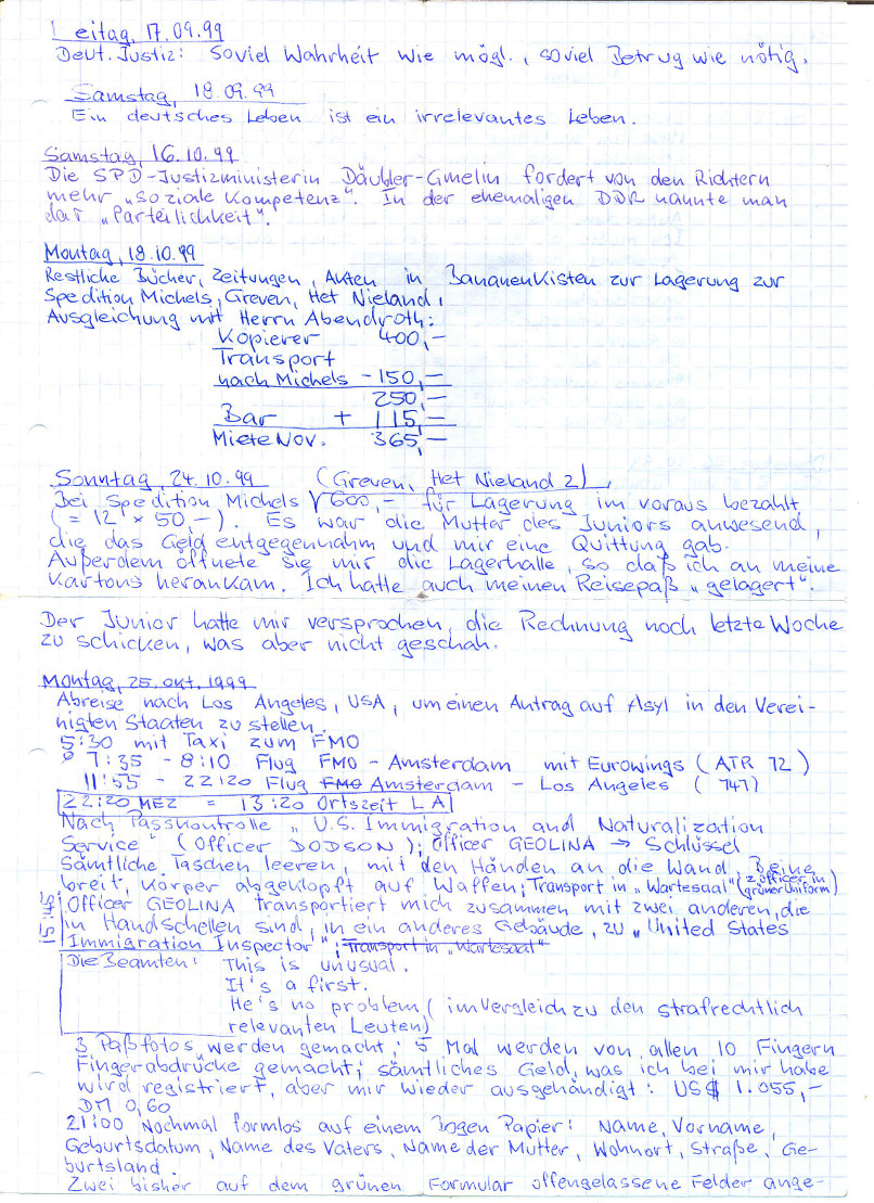 Der BRD-Staat hatte keinen Anstand genommen, mich in den Knast zu stecken. In der Gefangenschaft hatte ich Zeit, über Konsequenzen nachzudenken. Denn soviel war sicher: Ohne Konsequenzen konnte der Knast nicht bleiben. Wie es meinem sehr zum Grundsätzlichen und Rationalen neigenden Naturell entspricht, wählte ich eine Ausweich-reaktion. So fiel die Entscheidung für eine Flucht nach Amerika. Natürlich hatte und habe ich einen Begriff davon, was Realpolitik ist. Dennoch war mein Versuch, als Deutscher in den USA Asyl zu bekommen, kein Spiel. Es war Ernst. Meine Einreise erfolgte mit einem Touristen-Visum. Natürlich wußte ich, daß ich in Amerika durch Überschreiten des Visums in die Illegalität gehen konnte. Aber ich wollte nichts Illegales tun. Ich wollte kein amerikanisches Recht brechen, und ich habe kein amerikanisches Recht gebrochen. So habe ich die kalendarische Jahrtausendwende auf amerikanischem Boden verbracht - immerhin. |