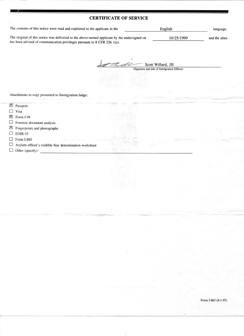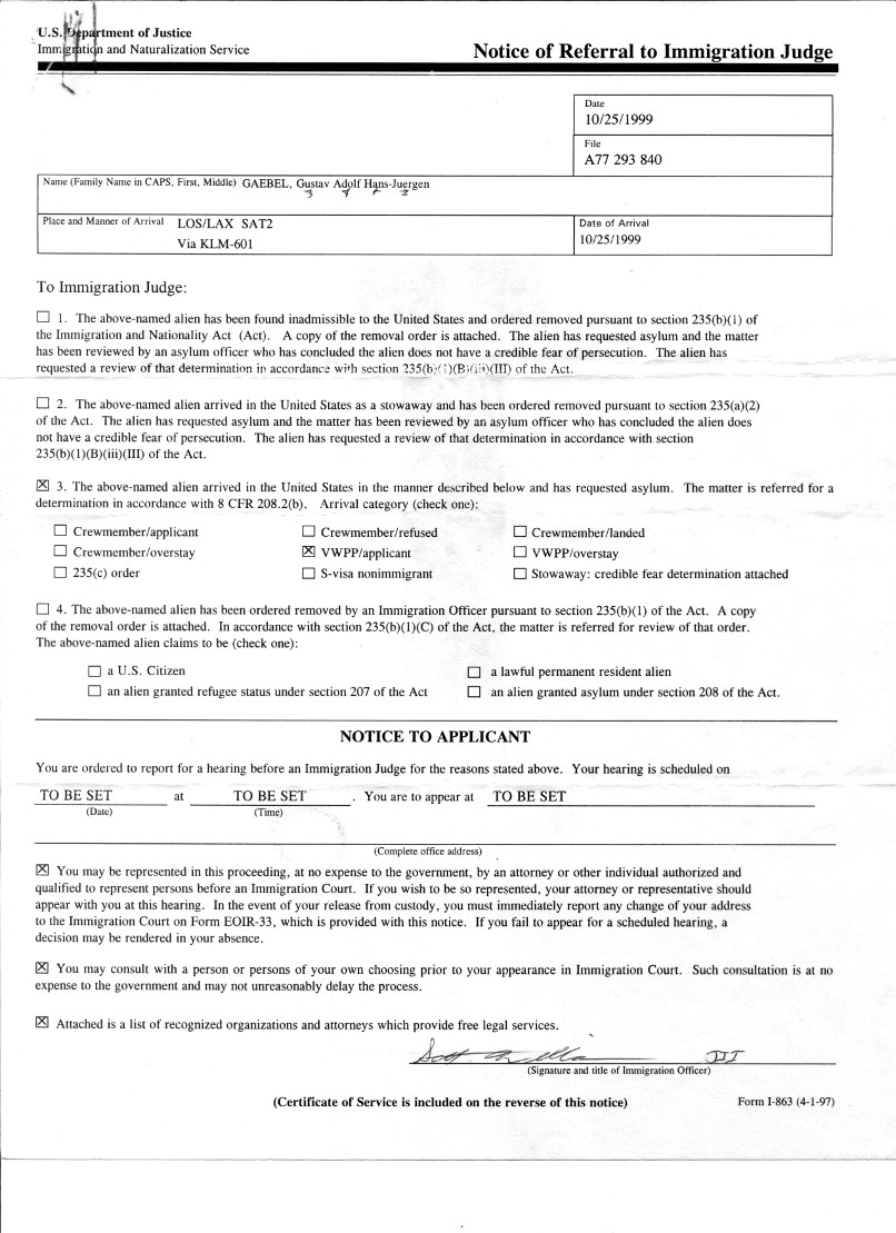| Notice of Referral to Immigration Judge vom 25. Oktober 1999 |