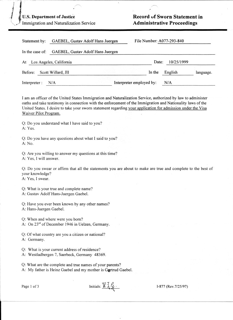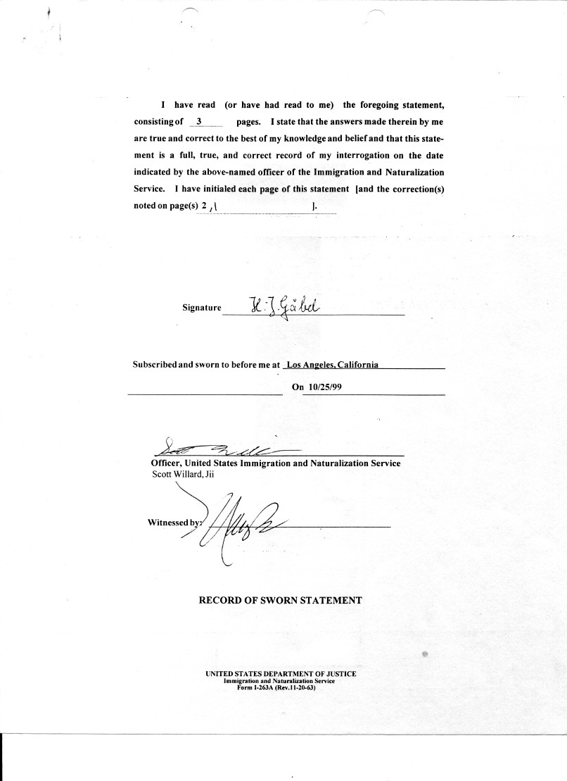 | Record of Sworn Statement vom 25. Oktober 1999 |