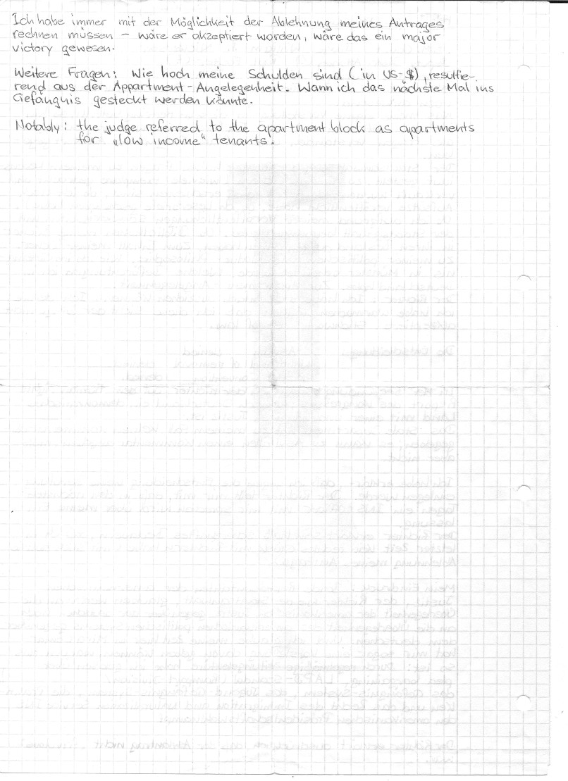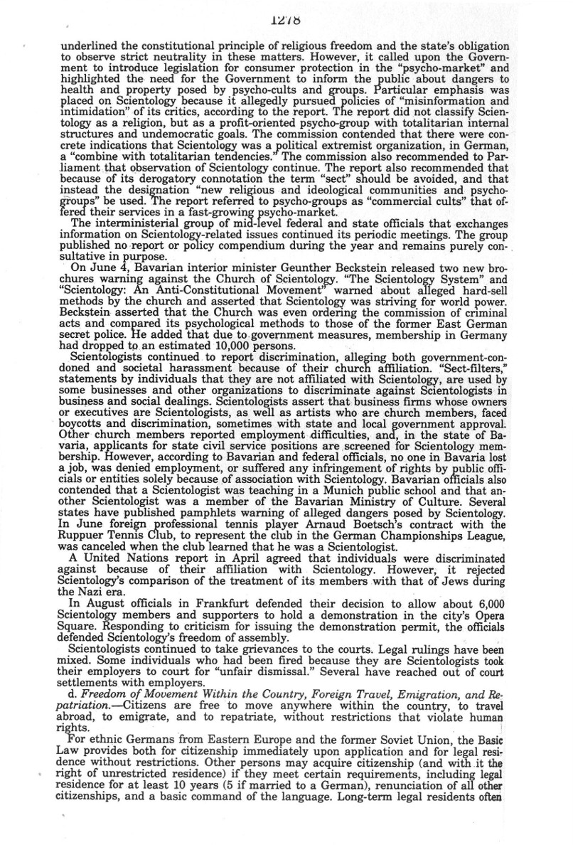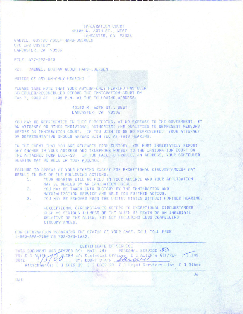 Mittwoch, 05. Januar 2000: Court Eine Entscheidung konnte noch nicht getroffen werden, da eine Stellungnahme von Seiten des State Department in Washington D.C. noch nicht vorlag. Ich erhielt vom Richter eine Kopie von "Country Reports on Human Rights Practices for 1998-Volume II / Germany" des Department of State. Ich überreichte die Übersetzungen meiner Lebenslauf-Dokumente. |