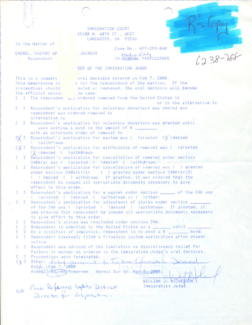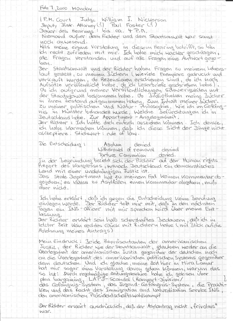 Montag, 07. Februar 2000: Court Entscheidung: Asyl-Antrag abgelehnt. |