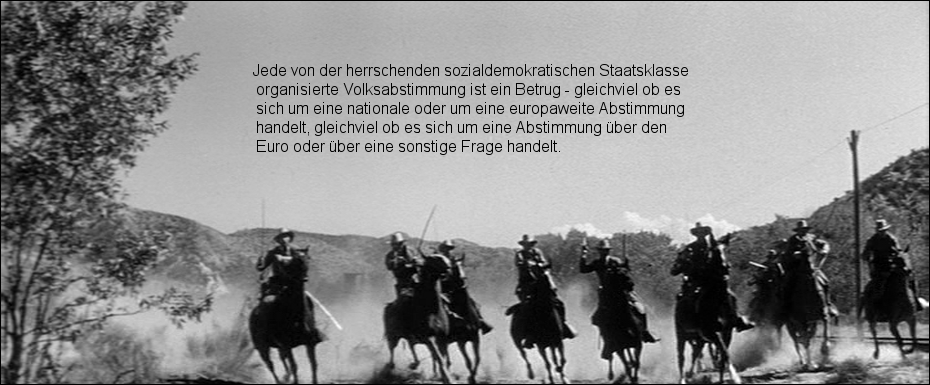 Vertrauen ist in der Sozialdemokratischen Republik Deutschland eine in jeder Hinsicht knappe Ressource. Die Allgegenwart, Allzuständigkeit und Totalkontrollanmaßung des BRD-Staates erfordern Transparenz darüber, inwieweit die BRD-Staatsklasse in ihrer Speckmadenexistenz vom Organspenderegime der BRD profitiert. ![]() Mittwoch, der 08. August 2012 Anfang Längeres Zitat Führende deutsche Konzernchefs appellieren an den Bundestag, das UN-Abkommen gegen Korruption so schnell wie möglich in Kraft zu setzen. "Das Ausbleiben der Ratifizierung schadet dem Ansehen der deutschen Wirtschaftsunternehmen", heißt es in einem Schreiben an alle Fraktionschefs. Ein demokratisches Land wie Deutschland müsse international glaubwürdig sein und dürfe sich nicht unnötig angreifbar machen. ... Die schwarz-gelbe Koalition blockiert bislang die Ratifizierung. Begründet wird dies mit dem im deutschen Recht unzureichend geregelten Straftatbestand der Abgeordnetenbestechung. Durch eine Verschärfung würden die Parlamentarier nach Ansicht von Union und FDP in der freien Ausübung ihres Mandats gehindert. Ende Längeres Zitat ![]() Was ist mit dem roten Lager? Hält den Ball flach. Hüllt sich in Schweigen. Gestern und heute. Macht ihre machtergreifende asymmetrische "Opposition". Hofft darauf, daß die "Bürgerlichen" - wie üblich - das rote politische Geschäft schon zufriedenstellend besorgen werden. Schmutziges sozialdemokratisches Gemeinwesen BRD, in dem die Roten sich auf die Schwarzen verlassen können ... Euro, Korruption, Homo"ehe" (WELT-ONLINE-Schlagzeile von gestern: "Familienministerin / Schröder will Homo-Ehe steuerlich gleichstellen") etc., etc. Dazu aus dem Leserforum den Kommentar von "milo": "Das ist doch mal was, Siemens, Daimler zahlten Unsummen und unterliegen der Beobachtung weil korrupt gewesen, Deutsche Bank in wohl jede Schweinerei verstrickt, die die Bankster weltweit ausgekocht haben, geben sich als Saubermaenner. Und die Bundestagsabgeordneten leisten einen Offenbarungseid mit der Begruendung fuer die Nichtratifizierung. Vielleicht hilft ja, wenn die Unterzeichnerfirmen offen legen, welche Abgeordnete sie ueber ihre Lobbyisten in den letzten Jahren bearbeitet haben, welche Gesetzesschreiber sie in welchem Ministerium platziert haben, erst dann ist dieser Appell glaubwuerdig." ![]() Freitag, der 10. August 2012 Anfang Längeres Zitat Die EU dürfe kein Projekt der Eliten bleiben, fordert der CSU-Chef. Über Kompetenzenübertragung an Brüssel, Aufnahme neuer Mitgliedsstaaten und Finanzhilfen für EU-Länder sollten die Bürger abstimmen. Ende Längeres Zitat ![]() Hat er wirklich das Wort "Eliten" in den Mund genommen? Die Negativauslese, die das Parteienstaatsystem zur politischen Klasse macht, bezeichnet er als "Elite"? Eine derartige Selbstbeweihräucherung, über die sich die Götter totlachen, kann wohl nur einem Angehörigen dieser Negativauslese einfallen. ![]() •II• Aus einem WELT-ONLINE-Bericht mit der Überschrift "EU-Schuldenkrise / Koalition rechnet offenbar mit Referendum zur EU": Anfang Längeres Zitat Angesichts der Schuldenkrise hält auch FDP-Fraktionschef Rainer Brüderle ein Referendum über die politische Zukunft der EU für möglich. "Wir können an einen Punkt kommen, an dem eine Volksabstimmung über Europa notwendig wird", sagte Brüderle dem "Hamburger Abendblatt". Die weitere Entwicklung der Krise werde zeigen, wie stark die EU-Länder zur Aufgabe von Souveränität aufgefordert seien. Ende Längeres Zitat ![]() |