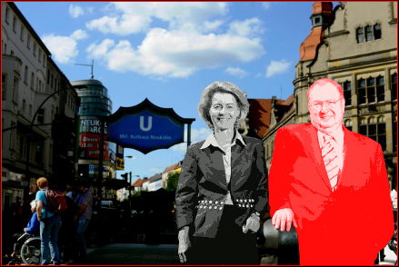 ![]() Montag, der 20. August 2012 Anfang Längeres Zitat 10 Jahre Hartz IV: Ursula von der Leyen (CDU) und der Berliner Bezirksbürgermeister Heinz Buschkowsky (SPD) diskutieren über Versäumnisse auf dem Arbeitsmarkt und den Kampf gegen Bürokratie. Ende Längeres Zitat ![]() Das gesamte Interview mit den beiden verdiente es, von vorn bis hinten zitiert zu werden. Ein Dokument über den (totalitären) Charakter des sozialdemokratischen Arbeitslagers BRD. Eine Selbst-Kompromittierung der autoritären Charaktere, die in der BRD den Ton angeben. Eine Demonstration der politisch-kulturellen Identität von Rot und Schwarz. Besonders hochmütig die Diktion der Schwarzen, die geradezu begierig ist, ihre Zuchtmeisterattitüde gegenüber "diesen Leuten" herauszukehren.
