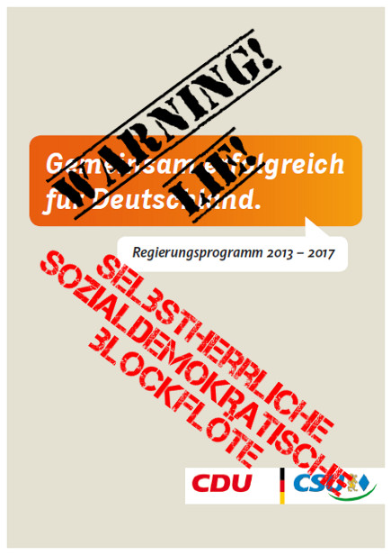 Wir brauchen einen Feldzug gegen das Übel des Sozialdemokratismus. Die Sorge dabei ist nicht die Ökonomie, sondern die Seele des Menschen ← •II• Aus einem "sueddeutsche.de"-Bericht mit der Überschrift "Treffen der Euro-Finanzminister / Euro-Gruppe beschließt Eckpunkte für Bankenhilfe ": Anfang Längeres Zitat Bundesfinanzminister Wolfgang Schäuble (CDU) betonte, der ESM könne jedoch "nur unter engen Voraussetzungen die letzte Station" für angeschlagene Banken sein. "Wenn manche die Erwartung haben, wenn eine Bank in Zukunft Kapital braucht, geht sie zum ESM, dann ist das natürlich Unsinn." ESM-Zahlungen an eine Bank sollen nur erlaubt werden, wenn etwa das Heimatland sonst selbst Probleme bekommt oder eine mögliche Pleite des Geldinstituts das Finanzsystem ins Wanken bringen kann. Ende Längeres Zitat ![]() Wir verstehen, daß die ESM-"Gouverneure" hier die volle Strenge europäischer Rechtsstaatlichkeit als Meßlatte anlegen werden. ;-) Die Lage für die "mündigen Bürger" Europas ist unübersichtlich, das Tempo des "gesellschaftlichen Wandels" in Europa rasant. ;-) Daher stellen sich für den "Bürger" Fragen: Hat der deutsche Bundestag ("Volksvertretung") die neue Geschäftsgrundlage des "ESM" (nicht nur Staaten, auch Banken sollen nun von ihm bedient werden) eigentlich schon abgesegnet? Es geschieht doch alles streng demokratisch, nicht wahr? ;-) Hat der deutsche "Staatsbürger" nun erneut ein Klagerecht gegen einen ESM, dessen Geschäftsgrundlage geändert wurde? Die bisher anhängigen Klagen gegen den ESM gingen davon aus, daß der ESM nur Staaten bedient. Es ist doch alles streng rechtsstaatlich, nicht wahr? ;-) ![]() Samstag, der 22. Juni 2013 Anfang Längeres Zitat Interessant ist auch, was nicht im Programm steht: CDU und CSU verzichten auf eine Koalitionsaussage zugunsten der Liberalen. Das Wort "FDP" kommt auf den 125 Seiten kein einziges Mal vor. Die Union will - auch wegen der Erfahrungen bei der Landtagswahl in Niedersachsen - einen Wahlkampf "Union pur" führen. Um Leihstimmen an die FDP zu vermeiden, werden CDU und CSU diesmal noch stärker die Bedeutung der Zweitstimme herausstreichen. Diese soll als eine Art "Merkel-Stimme" beworben werden. Da im September zum ersten Mal das neue Wahlrecht gilt, kann die Union aus Überhangmandaten keinen Vorteil mehr ziehen. Ende Längeres Zitat ![]()