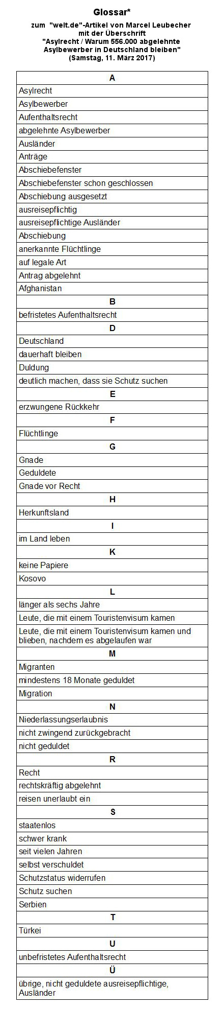 Mittwoch, der 15. März 2017 Anfang Längeres Zitat Rund eine halbe Million abgelehnte Asylbewerber leben in Deutschland. Die meisten seit vielen Jahren. Jeder zweite hat ein unbefristetes Aufenthaltsrecht. Die Gründe dafür sind vielfältig. Einer wird schwer krank, der nächste bekommt keine Papiere aus seinem Herkunftsland und der übernächste ist staatenlos. Tausend Gründe führen dazu, dass abgelehnte Asylbewerber im Land bleiben. 556.499 Ausländer, deren Anträge meist schon vor vielen Jahren rechtskräftig abgelehnt wurden, lebten zum 31. Dezember 2016 in Deutschland, wie aus einer Antwort der Bundesregierung auf Anfrage der Linksfraktion hervorgeht, die auch der „Welt am Sonntag“ vorliegt. Die größten Gruppen abgelehnter Asylbewerber kommen aus der Türkei (76.919 Personen) dem Kosovo (68.114) Serbien (49.746) und Afghanistan (32.784). Vier von Fünf (404.000) sind schon länger als sechs Jahre im Land. Doch nur wenige dieser Migranten müssen noch ihre erzwungene Rückkehr fürchten: Für sie hat sich das Abschiebungsfenster schon geschlossen. Fast die Hälfte (46,1 Prozent) dieser abgelehnten Asylbewerber hat der Antwort der Bundesregierung zufolge bereits ein unbefristetes Aufenthaltsrecht, die sogenannte Niederlassungserlaubnis. Sie dürfen also dauerhaft bleiben. Ein zusätzliches Drittel der abgelehnten Asylbewerber (34,5 Prozent) verfügt über ein befristetes Aufenthaltsrecht. Das können abgelehnte Asylbewerber bekommen, wenn sie mindestens 18 Monate geduldet sind, ihre Abschiebung also ausgesetzt ist und sie diesen Umstand nicht selbst verschuldet haben. Insgesamt sind also von der guten halben Million abgelehnter Asylbewerber nur die übrigen 19,4 Prozent ausreisepflichtig (107.961 abgelehnte Asylbewerber). Und auch sie werden nicht zwingend zurückgebracht, sondern nur, wenn sie nicht geduldet sind. Wie viele das waren beantwortet die Bundesregierung nicht. Zu den Geduldeten insgesamt gibt es aber Angaben: Von den 213.000 ausreisepflichtigen Ausländern, die am 31. Januar 2017 im Land lebten, hatten 155.000 eine Duldung, wie das Bundesamt für Migration und Flüchtlinge der „Welt am Sonntag“ im Februar mitgeteilt hatte. Nur die übrigen, nicht geduldeten ausreisepflichtigen, Ausländer müssen in der nächsten Zeit eine Abschiebung fürchten. Um ausreisepflichtig zu werden, muss man nämlich nicht unbedingt abgelehnter Asylbewerber sein, darunter sind auch anerkannte Flüchtlinge, deren Schutzstatus widerrufen wurde oder Leute, die einfach mit einem Touristen- oder Arbeitsvisum kamen und blieben, nachdem es abgelaufen war. Auch ein Teil der Asylbewerber kommt auf diese legale Art und stellt später einen Antrag. Die meisten Asylbewerber reisen aber unerlaubt ein, was nicht bestraft wird, wenn sie deutlich machen, dass sie Schutz suchen. Und auch wenn ihr Antrag abgelehnt wird, ergeht oft Gnade vor Recht. Ende Längeres Zitat ![]()